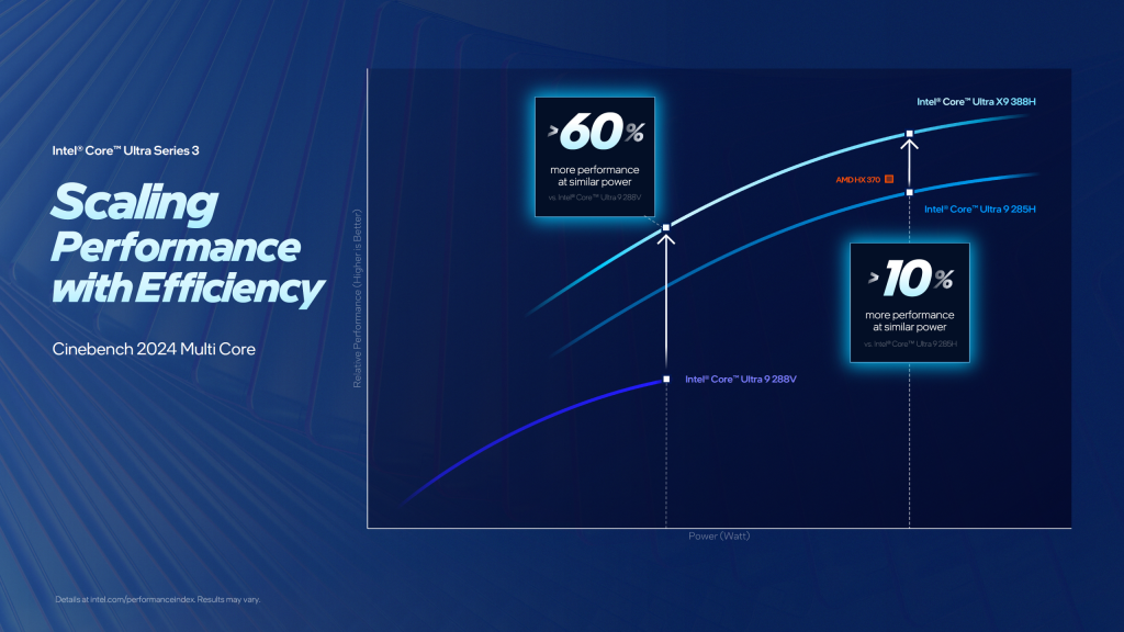 Intel ระบุว่าที่พลังงานเท่ากัน Panther Lake ให้ประสิทธิภาพแบบ single-thread สูงกว่า Lunar Lake และ Arrow Lake ราว 10% ขณะที่ประสิทธิภาพแบบ multi-thread เพิ่มขึ้นมากกว่า 50% และยังประหยัดพลังงานได้ดีขึ้นถึง 30% เมื่อเทียบกับ Arrow Lake