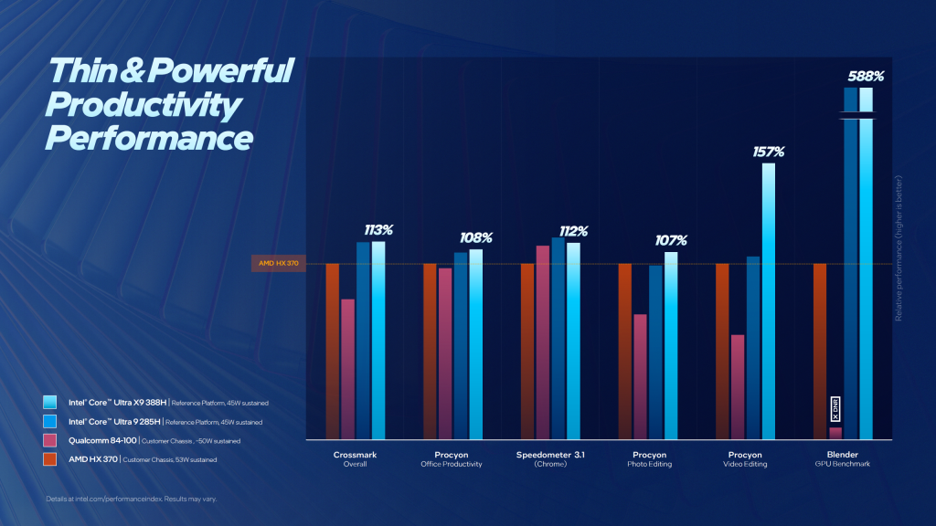 ในกลุ่มรุ่นท็อป Intel เปิดตัวคลาสใหม่อย่าง Core Ultra X9 และ X7 ที่มุ่งเป้าไปที่ผู้ใช้ระดับโปร เกมเมอร์ และสายสร้างคอนเทนต์โดยเฉพาะ รุ่นสูงสุดมาพร้อมซีพียูสูงสุด 16 คอร์ กราฟิก Xe3 สูงสุด 12 Xe-Cores และ NPU พลังประมวลผล 50 TOPS