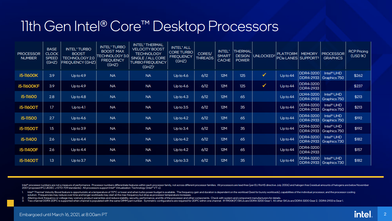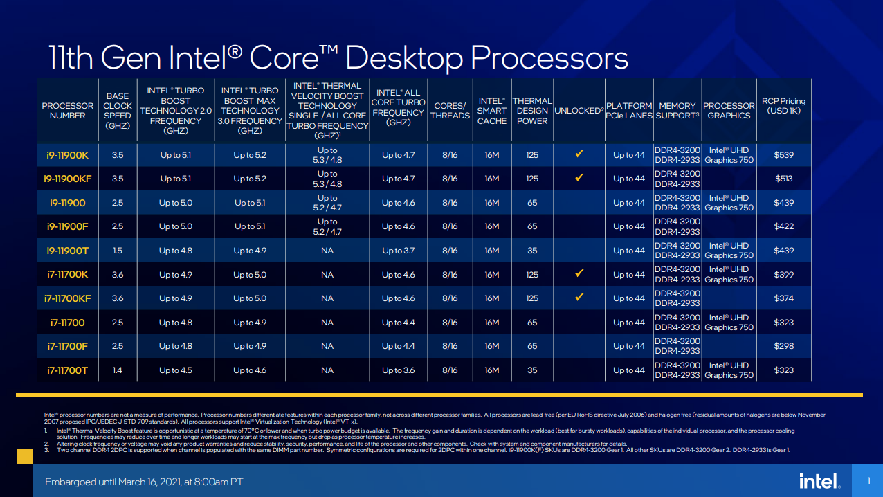 ตารางซีพียู Intel Gen 11 “Rocket Lake-S”