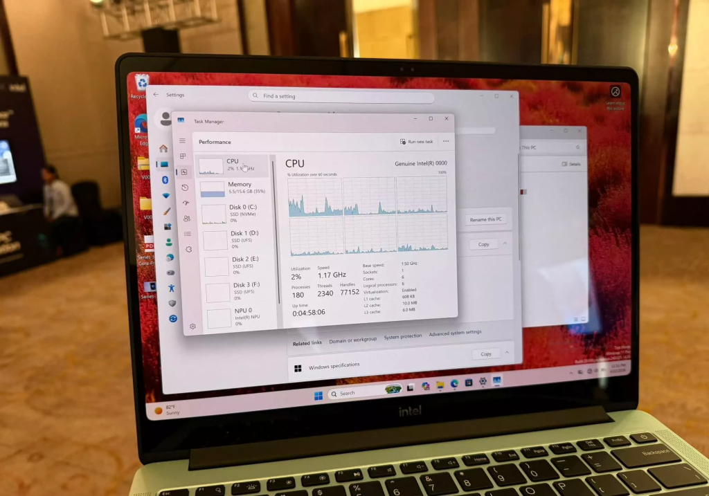หัวใจหลักของเครื่องอยู่ที่ชิป Intel Core Series 3 โค้ดเนม Wildcat Lake ซึ่งเป็นซีพียูรุ่นใหม่สำหรับโน้ตบุ๊กกลุ่มราคาประหยัดถึงระดับกลาง โดยเน้นประสิทธิภาพต่อพลังงานเป็นหลัก ชิปที่อยู่ในเครื่องต้นแบบเป็นซีพียู 6 คอร์ แบบ Hybrid แบ่งเป็น 2 P-core สถาปัตยกรรม Cougar Cove และ 4 LPE-core สถาปัตยกรรม Darkmont พร้อมกราฟิก Xe จำนวน 2 คอร์ และ NPU สำหรับงาน AI กำลังประมวลผล 17 TOPS