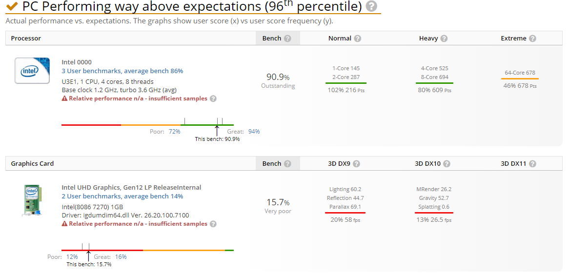 จากภาพจะเห็นได้ว่าผลทดสอบหน่วยประมวลผลแบบ 1 Core ได้คะแนนอยู่ที่ 146 คะแนน, 2 Core ได้ที่ 286 คะแนน และ 4 Core ที่ 551 คะแนน ส่วนใช้เต็มประสิทธิภาพ 8 Thread ได้ 701 คะแนน ซึ่งหากดูตารางประสิทธิภาพของ CPU รุ่นอื่นๆ เทียบกันแล้วได้ผลออกมาตามนี้