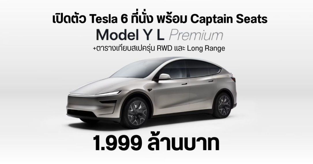 หลังรอคอยกันมานาน Tesla เปิดตัว Model Y L Premium 6 ที่นั่ง (หรือ Model Y L 6-Seater Long Range AWD) อย่างเป็นทางการในประเทศไทยแล้ว ราคาเริ่มต้นเพียง 1,999,000 บาท (CBU จากจีน) รุ่นนี้คือเวอร์ชันยืดฐานล้อพิเศษที่พัฒนามาเพื่อครอบครัวใหญ่โดยตรง มาพร้อมมอเตอร์คู่ AWD เร่ง 0-100 กม./ชม. ภายใน 5.0 วินาที ระยะทางวิ่งสูงสุด 681 กิโลเมตร (WLTP) ที่นั่งแบบ 2+2+2 กับ Captain Seat แถวสองที่ปรับไฟฟ้าและระบายอากาศได้ ระบบกันสะเทือน Adaptive ใหม่ และฟีเจอร์หรูหราแบบที่ไม่เคยมีใน Model Y รุ่นก่อน ๆ