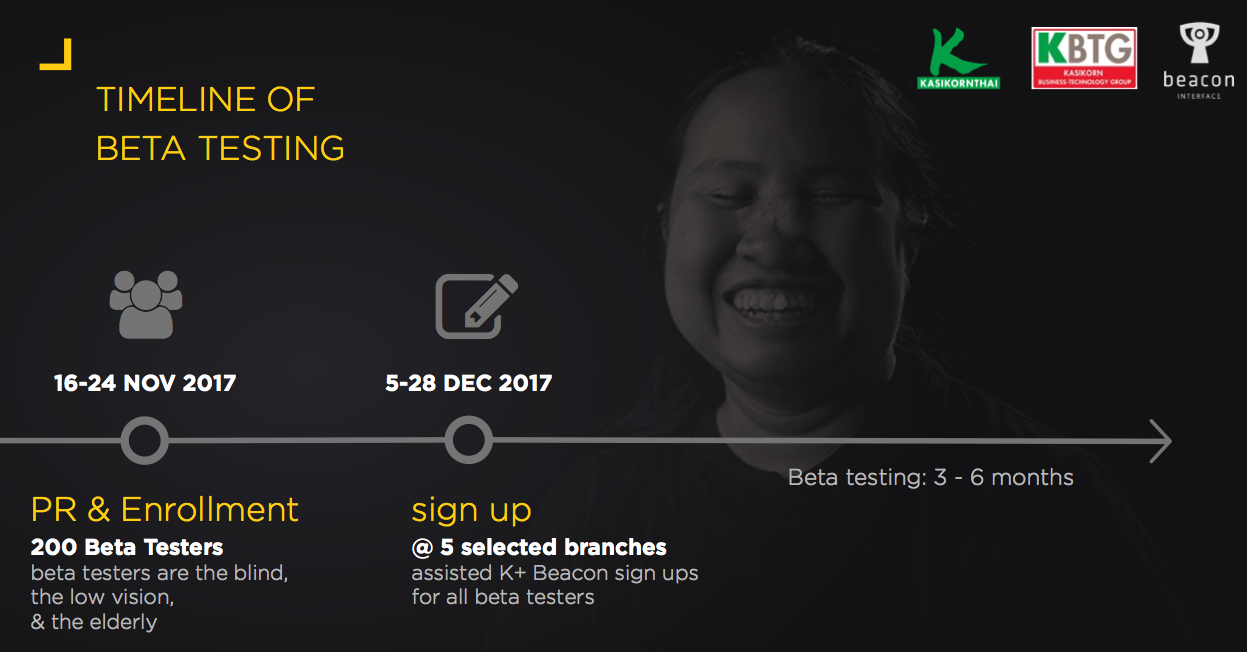 สำหรับตัวแอปนี้กำลังอยู่ในช่วงการทดสอบสุดท้ายก่อนเปิดให้ใช้งานจริงนะครับ โดยทางธนาคารได้เปิดให้ผู้ที่สนใจทดสอบใช้งานลงทะเบียนเพื่อเป็น Beta Tester กันในช่วงวันที่ 16-24 พฤศจิกายนนี้ ผ่าน 3 ช่องทาง คือ K-Contact Center โทร 02-8888888 กด 866, เว็บไซต์ธนาคารที่ www.kasikornbank.com/KPLUS-Beacon และ สมาคมคนตาบอดแห่งประเทศไทย โดยจะทำการคัดเลือกบุคคลทั้งคนตาบอด ผู้มีสายตาเลือนราง ผู้สูงวัย รวมถึงบุคคลทั่วไป รวมเป็นจำนวน 300 คน (ต่างจากภาพข้างบนนิดนึงนะครับ) จากนั้นจะเริ่มเปิดให้กลุ่ม Beta Tester นี้ได้เริ่มทดสอบ