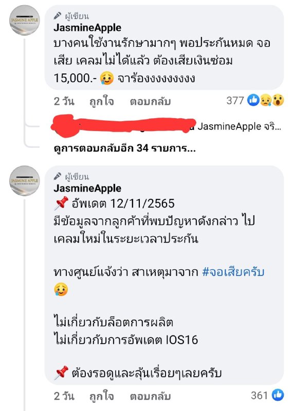 ทั้งนี้ยังมีผู้ใช้ iPhone 13 Pro Series หลายคนที่ตัวเครื่องดันมีปัญหาหลังใช้งานจนหมดระยะเวลาประกันแล้ว ซึ่งหากคนที่ซื้อประกัน Apple Care+ เพิ่มเติมก็ยังคงได้รับความคุ้มครองอยู่ แต่ผู้ใช้ที่ไม่ได้ซื้อประกันเพิ่มเติมต่างต้องลมจับเมื่อได้เห็นค่าซ่อมจอจากศูนย์บริการที่มีราคาแพงกว่า 15,000 บาท! ทำเอาร้านตู้ประกาศงดรับซื้อ/ขาย iPhone 13 Pro Series เพราะเกรงว่าอาจจะต้องแบกรับค่าใช้จ่ายในการซ่อมจอหากเกิดปัญหาขึ้นในอนาคต