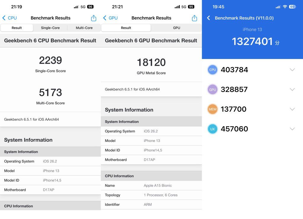 ในด้านประสิทธิภาพโดยรวม iPhone 13 ที่ใช้ชิป A15 Bionic ยังถือว่าแรงอยู่ คะแนนทดสอบที่ได้ยังอยู่ในระดับสูงเมื่อเทียบกับสมาร์ตโฟนทั่วไป แม้จะเปิดตัวมาหลายปีแล้วก็ตาม ส่วน RAM ที่ให้มา 4GB อาจดูน้อยในมุมของปี 2026 แต่ด้วยการจัดการหน่วยความจำของ iOS ทำให้การใช้งานจริงยังเพียงพออยู่ในปัจจุบัน เพียงแต่อีกระยะในอนาคตอาจต้องยอมรับว่ามีข้อจำกัดมากขึ้นตามอายุของแพลตฟอร์ม