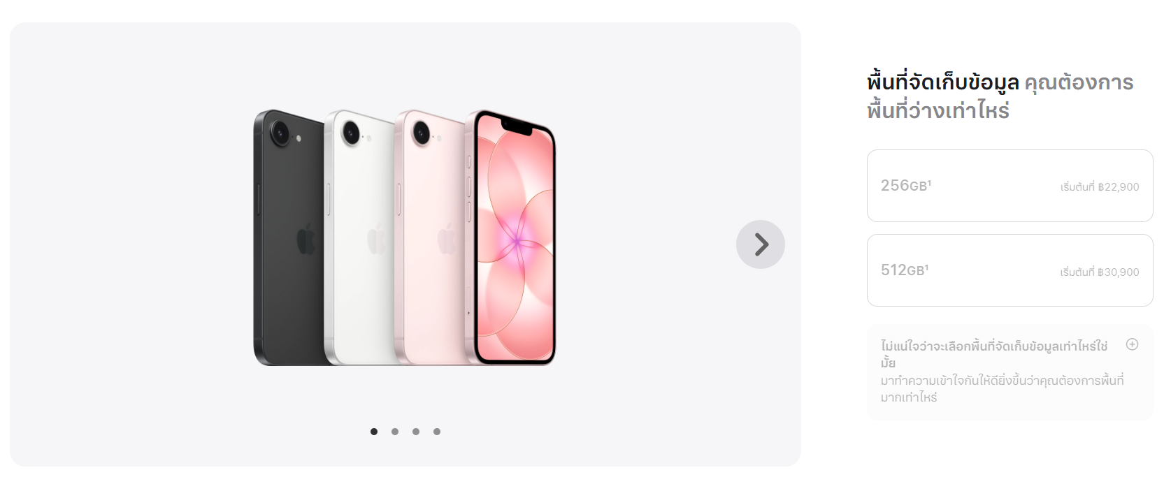 iPhone 17e เปิดตัวมาด้วยกันทั้งหมด 3 สี ได้แก่ สีชมพู (Soft Pink) สีขาว (White) และสีดำ (Black) ราคาเริ่มต้น 22,900.- เปิดให้สั่งซื้อล่วงหน้าได้วันที่ 4 ม.ค. 2569 และวางจำหน่ายอย่างเป็นทางการ 11 มี.ค. 2569