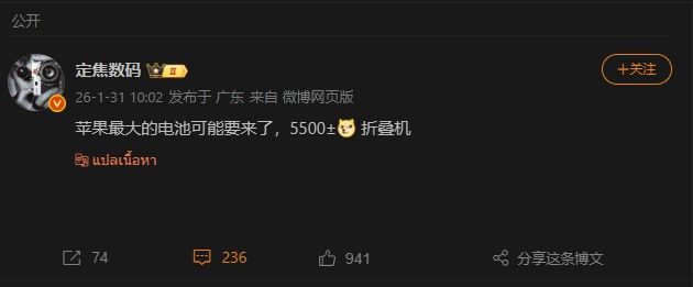 หลังจากมีรายงานออกมาอย่างต่อเนื่องเกี่ยวกับดีไซน์และวัสดุของ iPhone Fold ล่าสุดรายงานจากทิปสเตอร์ชื่อดังอย่าง Fixed Focus Digital ระบุว่า iPhone จอพับรุ่นแรกตัวนี้อาจมาพร้อมกับความจุแบตเตอรี่ 5,500 mAh หรือสูงกว่านั้น