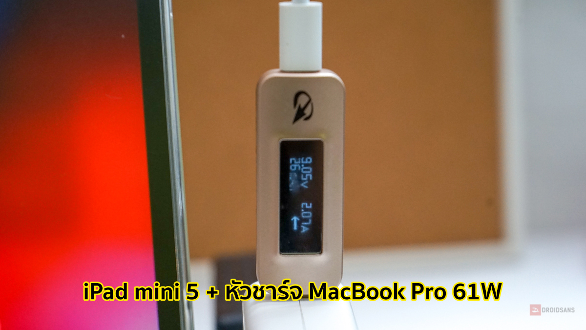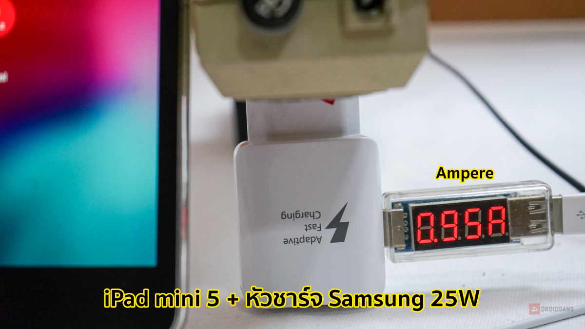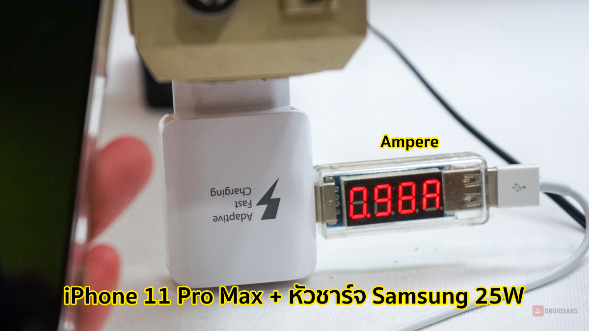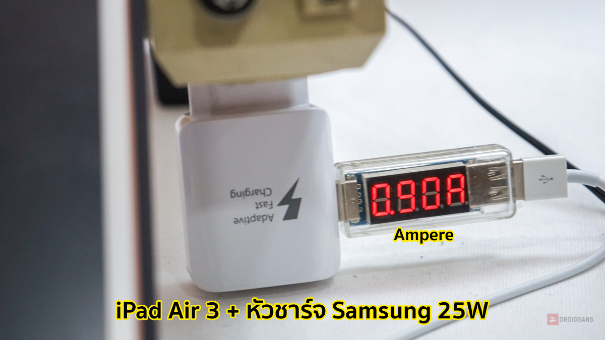 อุปกรณ์วัดกำลังไฟเสียบคั่นระหว่าง adapter และสายชาร์จ เพื่อตรวจสอบกระแสที่ไหลผ่าน ค่าที่ได้อาจมีความคลาดเคลื่อนได้เล็กน้อย แต่พอจะเห็นผลลัพธ์ที่ได้ในระดับหนึ่ง