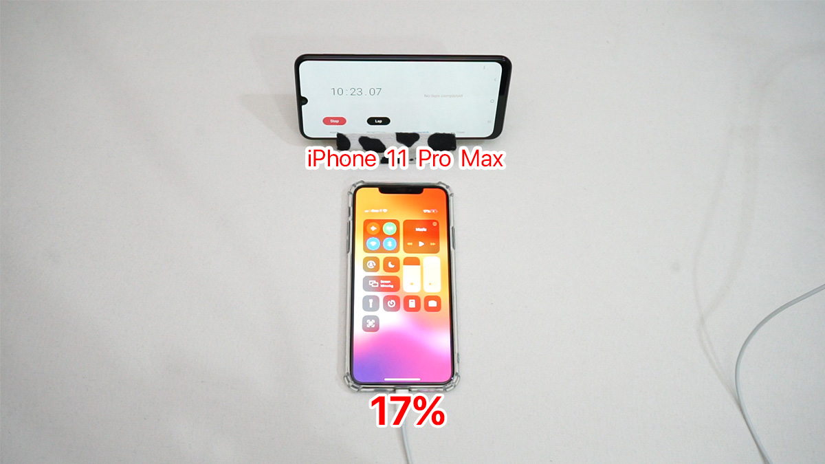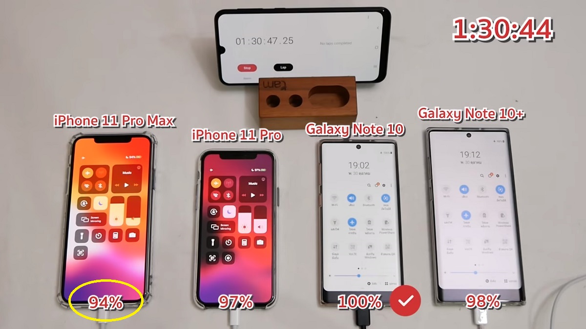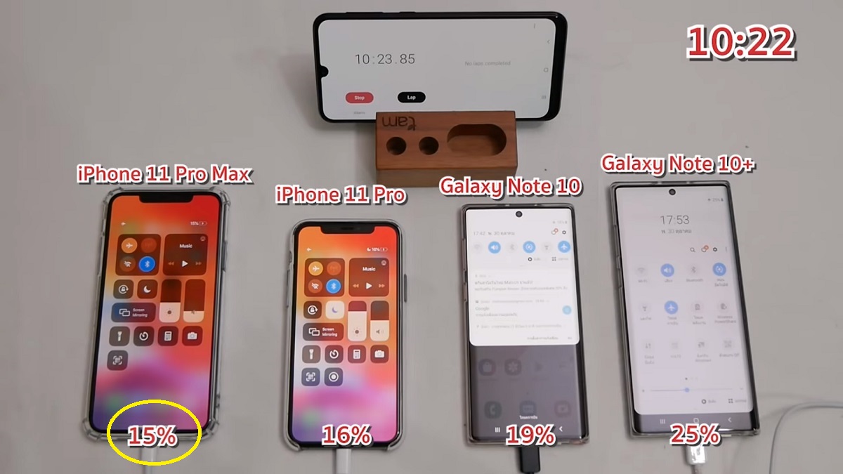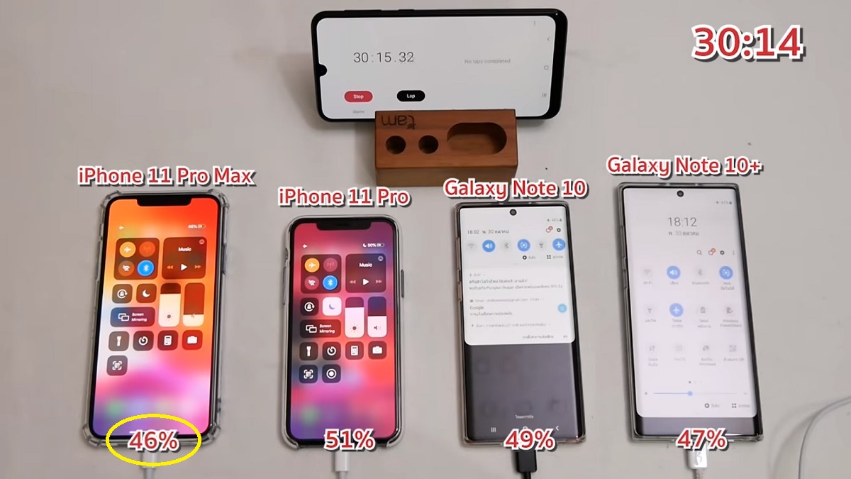 หลังจากที่ผลสรุปออกมาว่า iPhone 11 Pro Max รองรับการชาร์จไวสูงสุด 25W ทีมงานเลยสงสัยและทำการทดสอบต่อว่า หากเราจะชาร์จแบตจาก 0 ถึง 100% โดยใช้อะแดปเตอร์เดิม (18W) เทียบอะแดปเตอร์ของ Note10+ (25W) อันไหนจะชาร์จเร็วกว่ากัน ซึ่งผลที่ได้จะแบ่งเป็นช่วงเวลา ให้เห็นว่าแต่ละอุปกรณ์ชาร์จแบตได้กี่เปอร์เซ็นต์เมื่อเวลาผ่านไปแต่ละนาที