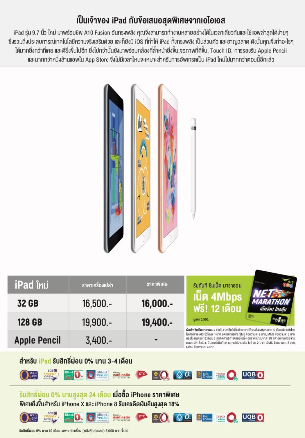 หรือใครที่อยากจะได้แทบเล็ตอย่าง iPad ก็มีราคาเครื่อง + โปร มาให้ด้วยเหมือนกัน กับราคาเริ่มต้นแค่ 9,500 บาท