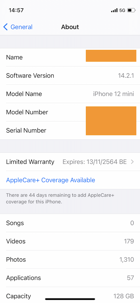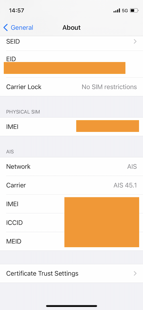 อีกปัญหาที่คนบ่นกันเข้ามา คือจับสัญญาณ 5G ไม่ได้ เข้าไปตั้งค่าในหน้า Voice & Data ก็ไม่มี 5G ให้เลือก อันนี้ให้ลองสังเกตอยู่สองส่วนในหน้า Settings > General > About ว่าเป็นเวอร์ชั่นดังต่อไปนี้หรือใหม่กว่าหรือยัง
