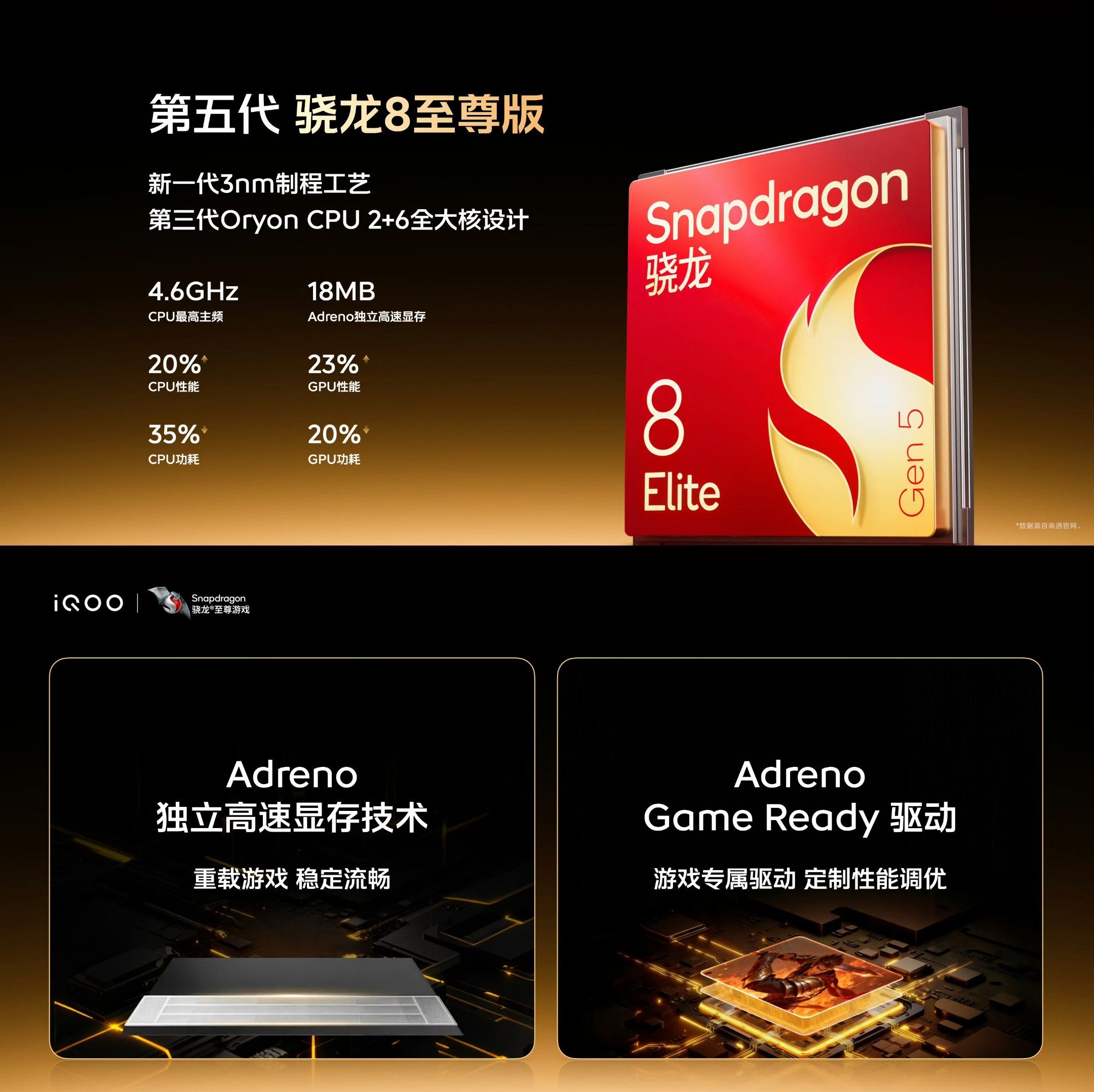 หัวใจสำคัญในการประมวลผลของ iQOO 15 ก็คือ Snapdragon 8 Elite Gen 5 ที่ผลิตบนเทคโนโลยี 3nm ใช้สถาปัตยกรรม All Big Core สูตร 2 + 6 มีความเร็วประมวลผลสูงถึง 4.6GHz รองรับหน่วยความจำกราฟิกความเร็วสูง (Independent High-Speed VRAM) พร้อมเทคโนโลยี Game Ready Driver ที่ปรับแต่งมาสำหรับเกมระดับ AAA โดยเฉพาะ