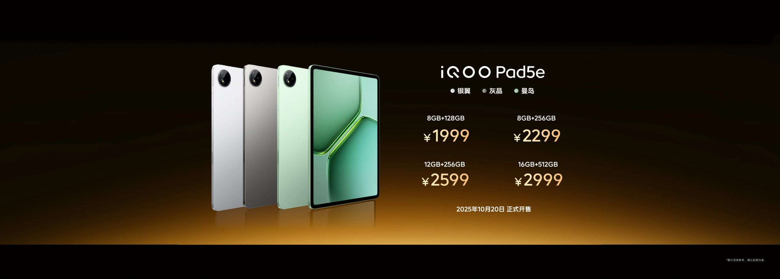 iQOO Pad 5e วางจำหน่ายในประเทศจีนทั้งหมด 3 สี ได้แก่ สีเขียว (Isle Green) สีเทา (Crystal Gray) และสีเงิน (Silver Wing) ในราคาดังนี้