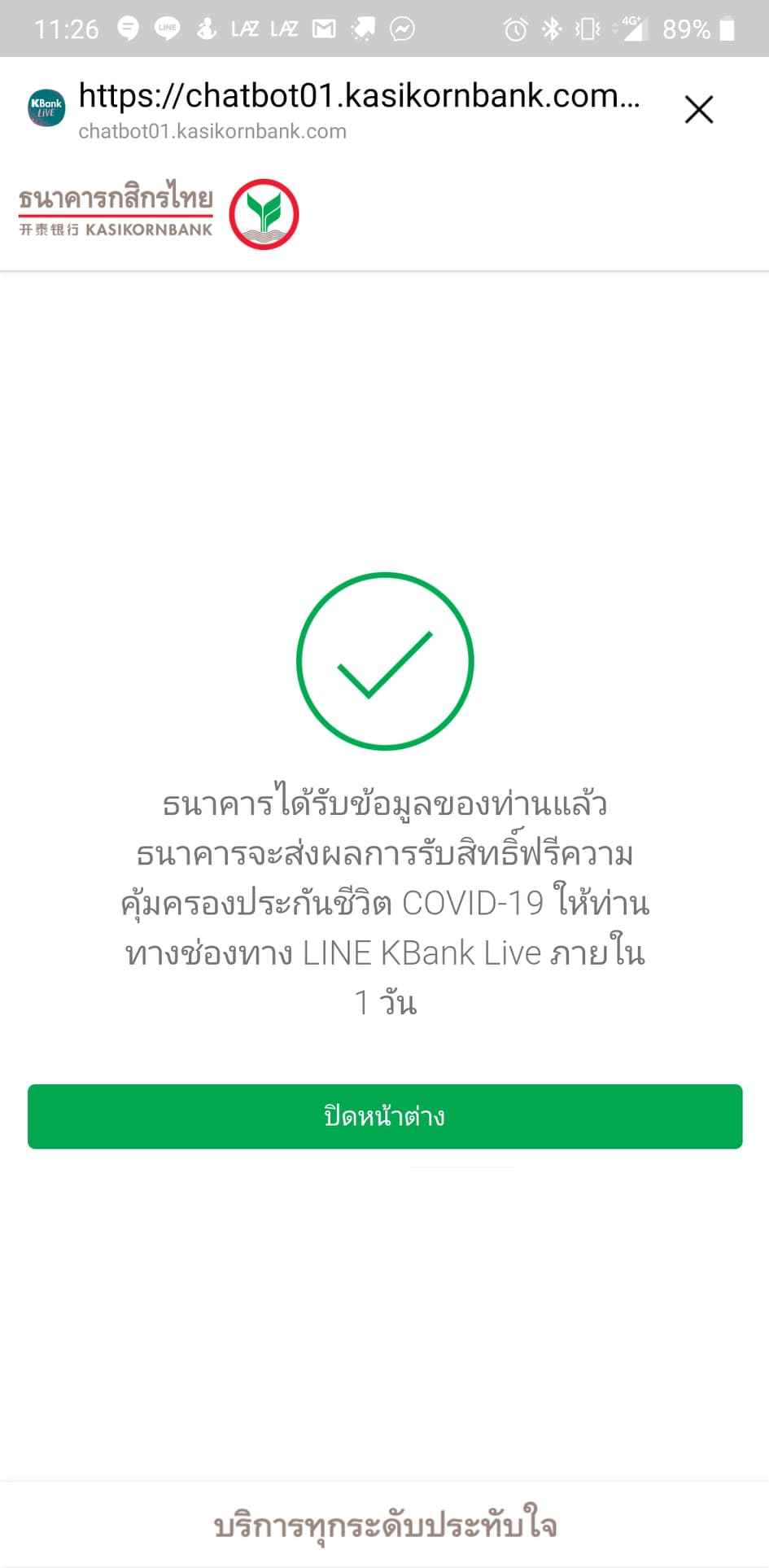 เท่านี้ก็เป็นอันเรียบร้อยครับ หลังจากได้รับข้อความยืนยันจากทาง LINE KBank Live กรมธรรม์ก็จะเริ่มคุ้มครองในวันถัดไป จนถึงวันที่สิ้นสุดความคุ้มครอง 30 90 วันครับ ยกตัวอย่างก็คือ ได้รับข้อความยืนยันวันที่ 29 กุมภาพันธ์ กรมธรรม์จะเริ่มคุ้มครองในวันถัดไป ซึ่งก็คือวันที่ 1 มีนาคมนั่นเอง