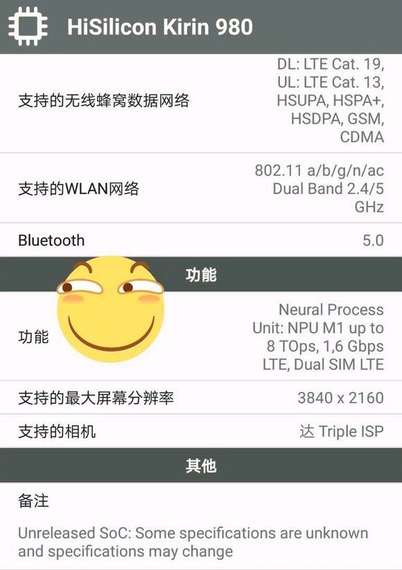 นอกจากผลคะแนนบน Antutu ที่ทะลุเกิน 350,000 แล้ว ล่าสุดก็มีภาพที่บอกรายละเอียดแทบทุกอย่างของ Kirin 980 โดยมันจะมาพร้อมกับซีพียู 8 คอร์ที่ 4 คอร์แรงเป็น Cortex-A77 @2.8GHz ส่วนคอร์ประหยัดพลังงานอีก 4 คอร์เป็น Cortex-A55 ที่ยังไม่ทราบ clock speed, รองรับ RAM ประเภท LPDDR4X, การ์ดจอ Mali-G72 MP24 , และ NPU (Neural Processing Unit) รุ่นที่สองสำหรับใช้ในการประมวลผลต่างๆเกี่ยวกับ AI พร้อมตัวประมวลผลภาพ (ISP) จำนวน 3 ตัวในการประมวลผลภาพถ่ายอย่างรวดเร็ว