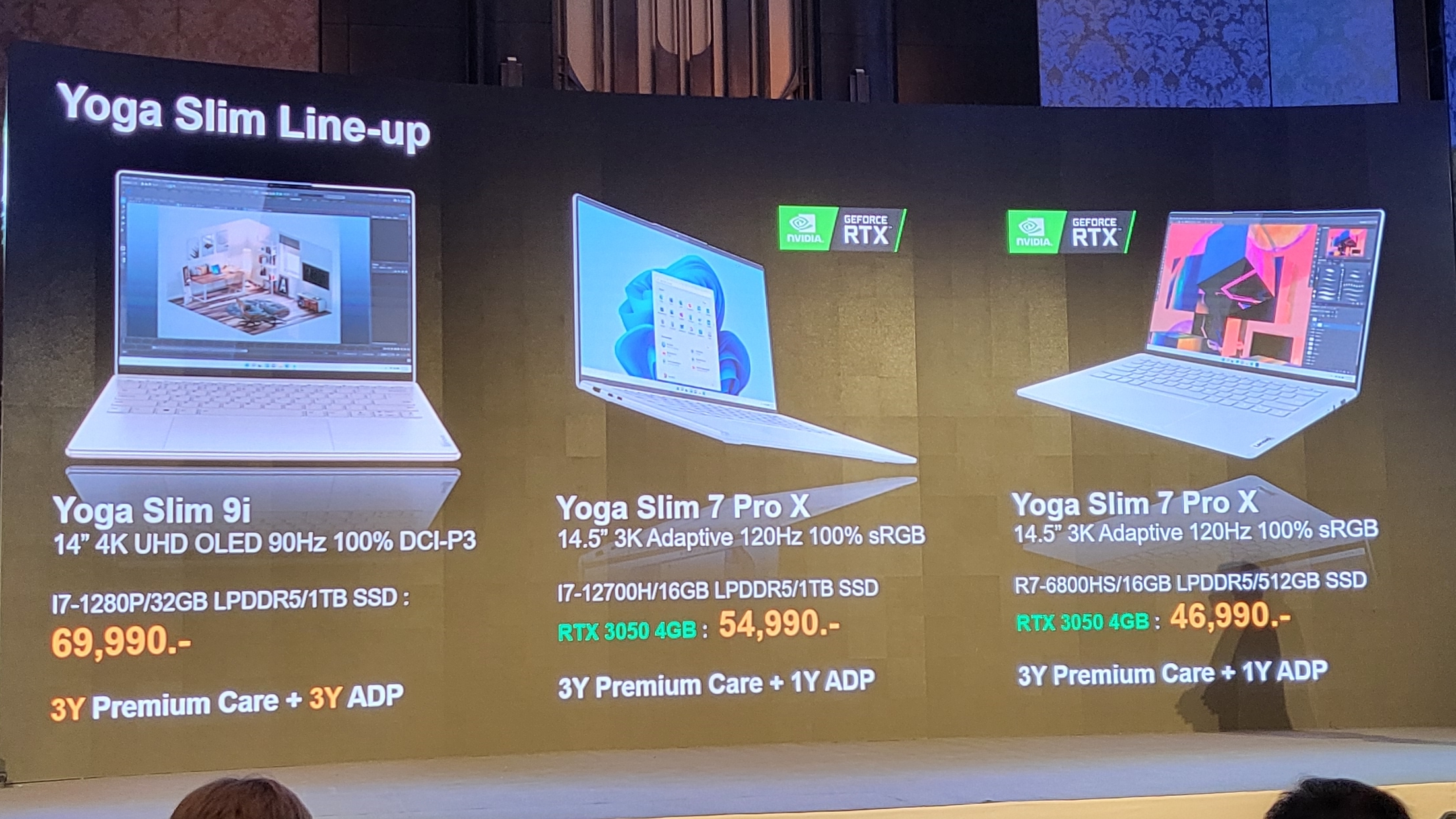 - Yoga Slim 7 Pro X | Ryzen 7 6800HS | Ram 16 GB LPDDR5 | SSD 512 GB | ราคา 46,990 บาท
