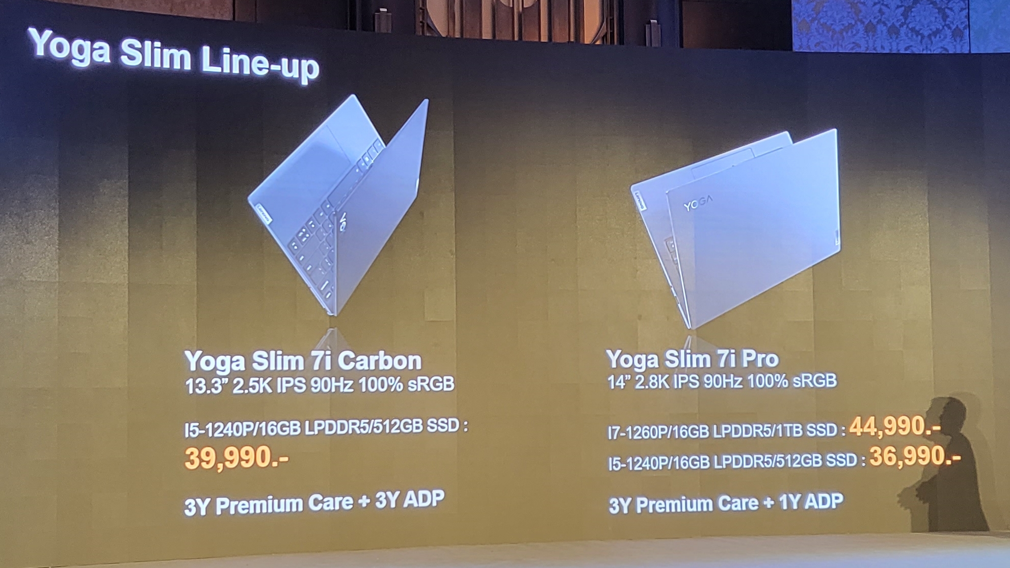 ประเดิมตัวแรกด้วยสินค้าตัวท็อปไลน์ที่สุดของงานอย่าง Yoga Slim 9i โน้ตบุ๊ครุ่นบางเบาประสิทธิภาพสูง มาพร้อมกับซีพียู Intel Core i7-1280P, แรมตัวเครื่อง 32GB LPDDR5, SSD ความจุ 1TB หน้าจอมีขนาด 14 นิ้ว 4K OLED 90Hz อัตราส่วน 16:10 ขอบเขตสี 100% DCI-P3 ทัชแพดมีขนาดกว้างขึ้นถึง 50% พร้อม gesture การสั่งงานที่ฉลาดขึ้น แบตเตอรี่ตัวเครื่องเคลมใช้ได้นานสุด 14.5 ชม. ทั้งหมดนี้ในราคาเริ่มต้น 69,990 บาท