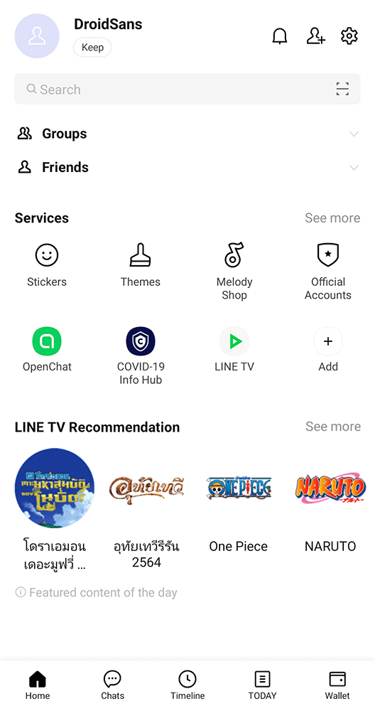 - จากหน้า “โฮม” ของ LINE ให้ไปที่ “ตั้งค่า” (ไอคอนรูปเฟืองบริเวณมุมขวาบน)