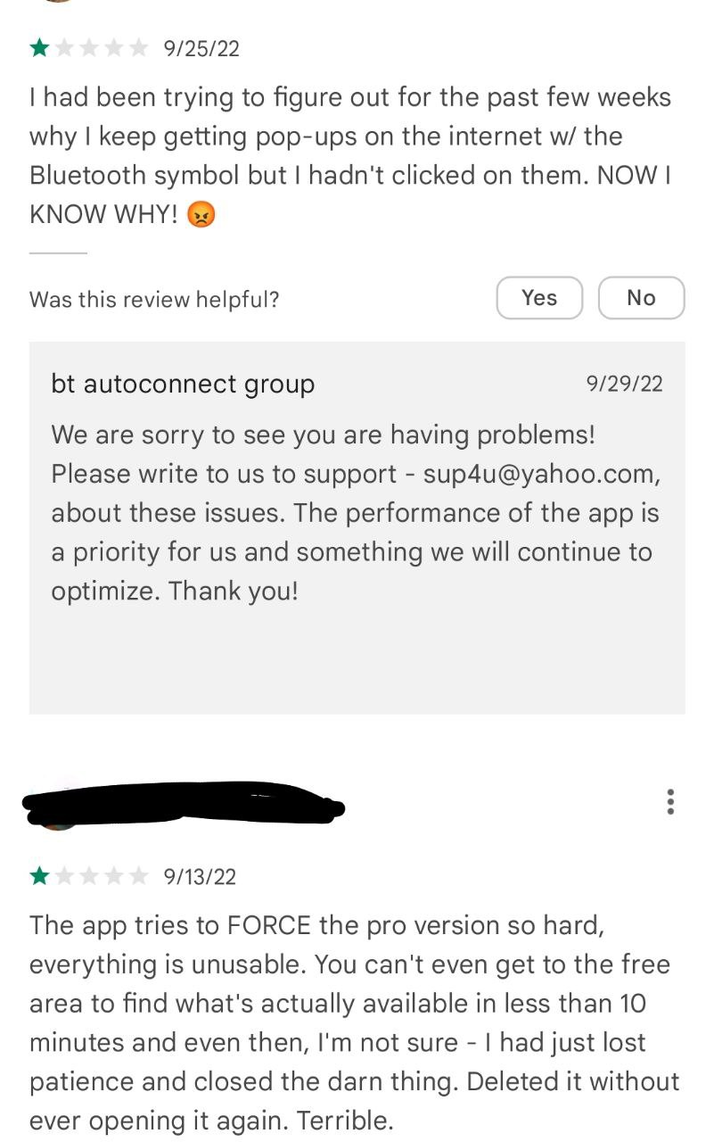 ดังนั้นจึงพอคาดการณ์ได้ว่า การดีเลย์ขึ้นโฆษณา 72 ขั่วโมงนี้กลายเป็นเทคนิคในการผ่านการทดสอบแอปของ Google ไปได้ แต่ถ้าดูในรีวิวก็จะเห็นได้ว่ามีคนมาบ่นเรื่องแอปโชว์โฆษณากันเต็มไปหมด แถมผู้พัฒนายังจะมาคอยตอบรีวิว เชิญชวนให้คนอัปเกรดเป็นเวอร์ชันพรีเมี่ยมกันอีก แสบเข้าไส้จริง ๆ