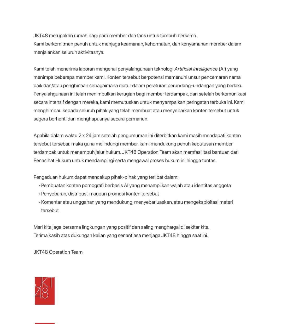 เช่นเดียวกับ JKT48 วงไอดอลจากประเทศอินโดนีเซียที่หน่วยงานรัฐก็เพิ่งจะ ประกาศแบน Grok อย่างเป็นทางการไปหมาด ๆ ก็ได้แถลงการณ์โดยมุ่งเป้าไปยังบุคคลหรือกลุ่มแฟนคลับซึ่งใช้ AI ร่วมกับรูปภาพของสมาชิกในทางที่ผิด และไม่ได้รับการยินยอม