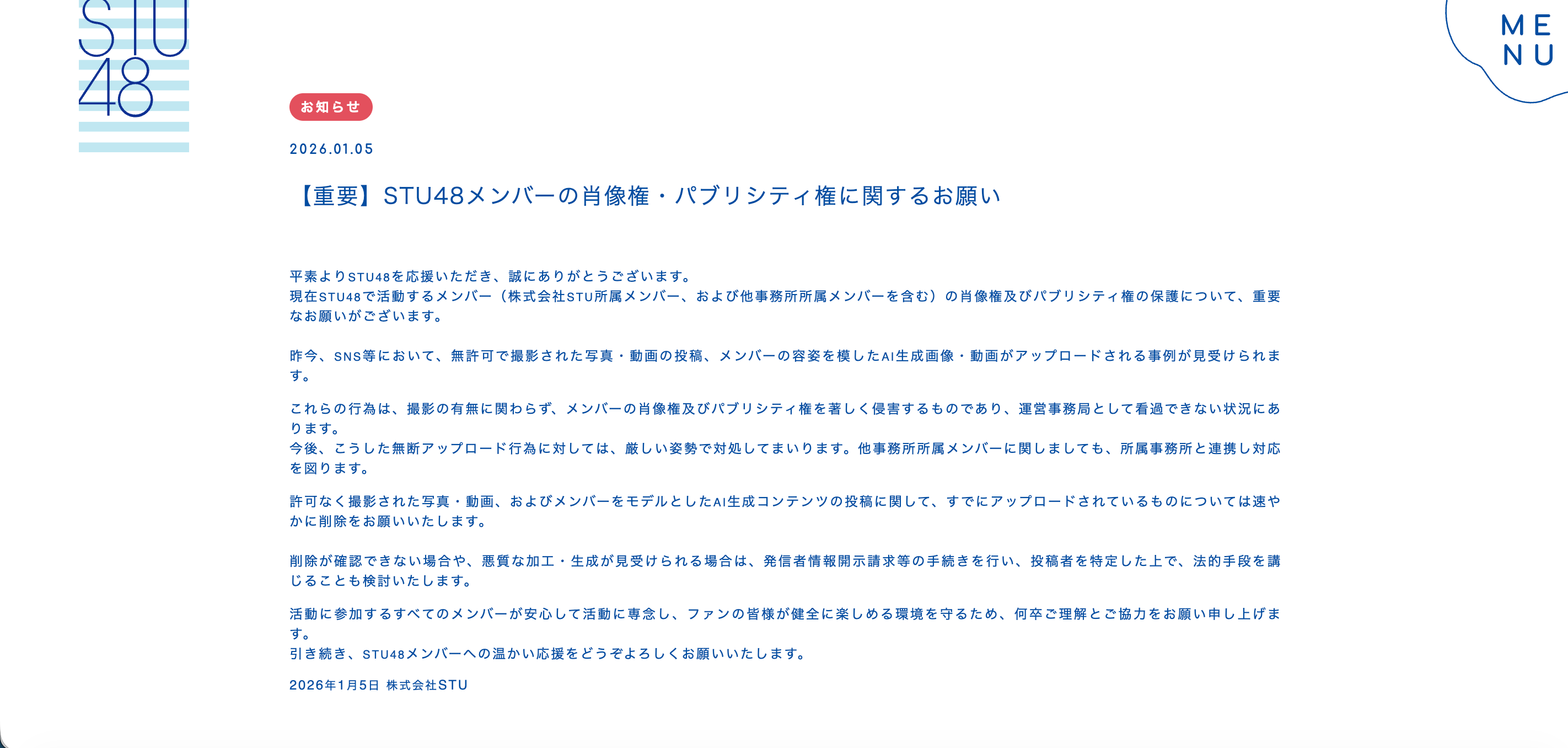ทางฝ่ายบริหารของ STU48 ระบุว่าการใช้ AI เพื่อเจนภาพหรือวิดีโอของสมาชิกในวงถือเป็นการละเมิดสิทธิอย่างร้ายแรง และทางค่ายจะใช้มาตรการขั้นเด็ดขาด (Firm stance) ต่อผู้ที่นำรูปไปดัดแปลงโดยไม่ได้รับอนุญาต