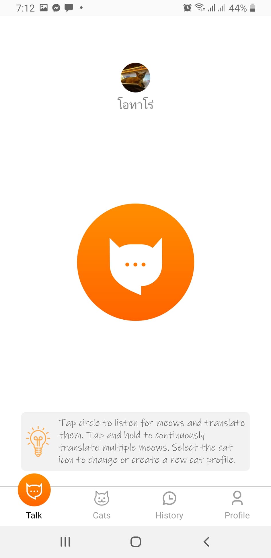 เห็นแบบนี้แล้ว ก็เลยต้องขอทดสอบกันหน่อยค่ะ ว่า MeowTalk จะแปลได้แม่นตามที่น้องอยากจะบอกเราหรือเปล่า โดยตัวแอปก็มี UI ที่เข้าใจง่ายๆ ไม่มีอะไรซับซ้อนค่ะ เปิดแอปเข้ามาก็จะเจอกับปุ่มสีส้มให้เรากดเพื่อบันทึกเสียงร้องของแมว จากนั้นตัวแอปก็จะประมวลผล แล้วก็บอกว่าน้องแมวต้องการจะสื่ออะไร