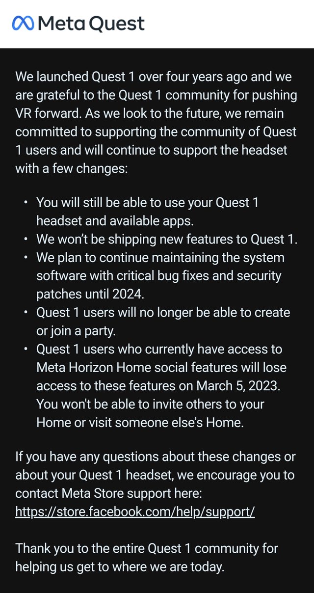 ทาง Meta เพิ่งส่งอีเมลให้ผู้ใช้ Quest 1 ว่าต่อไปนี้จะไม่มีการอัปเดตด้านเนื้อหาให้แว่น VR แล้ว และอัปเดตความปลอดภัยกับแก้บั๊คจะสิ้นสุดลงภายในปี 2024