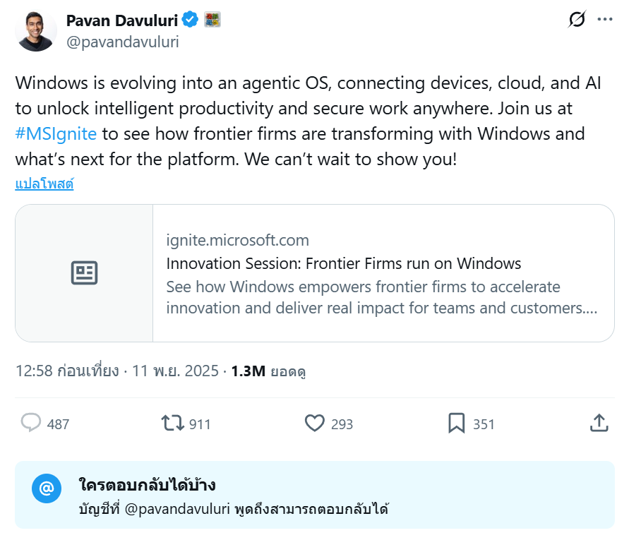 แต่แทนที่จะสร้างความตื่นเต้น กลับกลายเป็นลานจอดรถทัวร์ เพราะทันทีที่ผู้บริหาร Microsoft อย่าง Pavan Davuluri ออกมาโพสต์อัปเดตใน X และบอกว่าจะมีรายละเอียดเพิ่มเติมในงาน Ignite ก็โดนทัวร์ลงแบบไม่ยั้ง คอมเมนต์ถล่มจนต้องปิดคอมเมนต์ในที่สุด