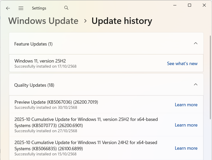 จากเดิมที่ชื่ออัปเดตใน Windows Update มักจะยาวและเต็มไปด้วยข้อมูล เช่น เวอร์ชันของระบบหรือชนิดของสถาปัตยกรรม ตัวอย่างเช่น 2025-10 Cumulative Update for Windows 11, version 25H2 for x64-based Systems (KB5066835) (26200.6899) ซึ่งฟังดูเข้าใจยากพอสมควร แต่ในรูปแบบใหม่ ไมโครซอฟท์จะใช้ชื่อที่สั้นและตรงประเด็นมากขึ้น เช่น Security Update (KB5066835) (26200.6899)