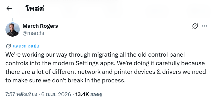 สาเหตุที่การเปลี่ยนผ่านนี้กินเวลานาน เป็นเพราะ Control Panel มีโครงสร้างที่ซับซ้อนและสะสมการตั้งค่าของอุปกรณ์และไดรเวอร์มาหลายยุค ทำให้ทีมวิศวกรต้องค่อย ๆ ย้ายฟังก์ชันอย่างระมัดระวัง เพื่อไม่ให้เกิดปัญหาหรือบั๊กตามมา ขณะเดียวกัน แอป Settings ก็ถูกออกแบบใหม่ให้ใช้งานง่ายขึ้น หน้าตาสะอาด และรองรับ Dark Mode ได้สมบูรณ์มากขึ้น