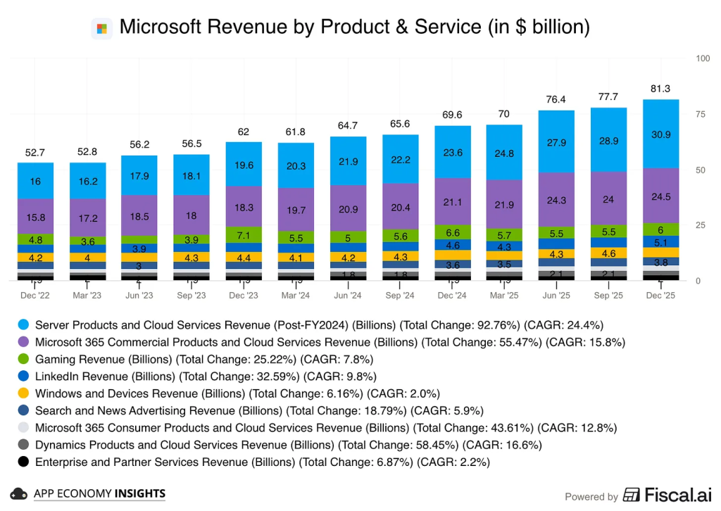 ประเด็นสำคัญคือ รายได้ของ Microsoft แทบไม่ได้พึ่งพา Windows เหมือนในอดีตอีกต่อไป เพราะรายได้จากกลุ่ม Windows และอุปกรณ์อยู่ที่เพียงราว 4,500 ล้านดอลลาร์ หรือราว 5.5% ขณะที่ธุรกิจ Server และ Azure ทำเงินได้กว่า 30,900 ล้านดอลลาร์ หรือราว 30.9% และในส่วนของ Microsoft 365 Commercial มีรายได้ 24,500 ล้านดอลลาร์ หรือราว 24.5%