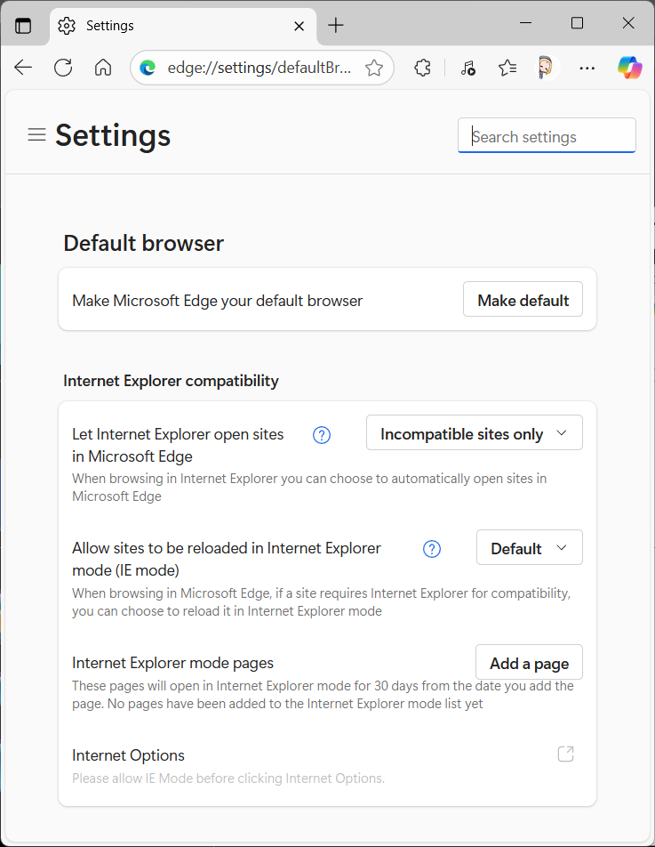 เพื่อความปลอดภัย Microsoft จึงตัดสินใจ ถอดปุ่มเปิด IE Mode ทางลัดออกทั้งหมด ทั้งในทูลบาร์ เมนูคลิกขวา และเมนูหลักของเบราว์เซอร์ ใครที่ยังต้องใช้จริง ๆ จะต้องเข้าไปตั้งค่าเอง โดยไปที่ Settings -> Default Browser → Allow sites to be reloaded in Internet Explorer mode แล้วกด Add เพื่อเพิ่มเว็บที่ต้องการเปิดในโหมดนี้ทีละเว็บเอง เพื่อให้แน่ใจว่าผู้ใช้ตั้งใจเปิดจริง ๆ และลดโอกาสโดนหลอกจากเว็บปลอมได้มากขึ้น