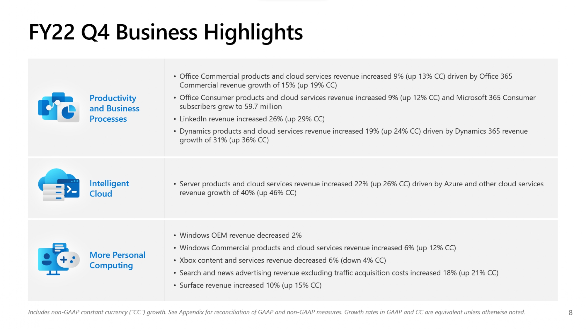อย่างไรก็ตาม ครั้งนี้ Microsoft รายงานเฉพาะตัวเลขรายได้อย่างเดียว ไม่ได้ระบุเป็นจำนวนเครื่องหรือกำไรให้ดู ในทางกลับกันรายได้ในฝั่ง Windows แบบ license OEM สำหรับพีซีและโน้ตบุ๊คกลับลดลง 2% คาดว่าเป็นผลมาจากภาพรวมของตลาดพีซีที่เริ่มชะลอตัว และผลกระทบจากนโยบาย Zero-COVID ที่ทำให้โรงงานในจีนหยุดการผลิตไปหลายแห่ง แต่ license ในฝั่ง Windows สำหรับคลาวน์และองค์กรยังคงเติบโตขึ้น 6% ซึ่งเป็นผลมาจากยอดขายฝั่ง Microsoft 365 ที่ดีขึ้นเรื่อย ๆ