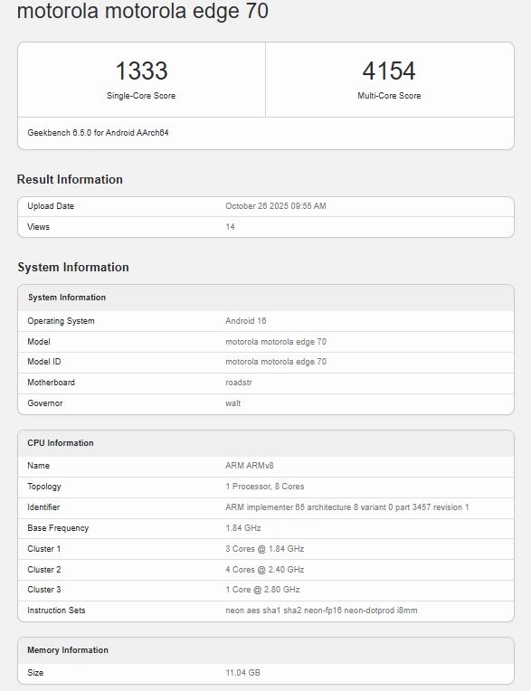 หลังจากประกาศวันเปิดตัวอย่างเป็นทางการไปเมื่อไม่นานมานี้กับ Motorola Edge 70 มือถือบางเฉียบรุ่นใหม่จาก Motorola ล่าสุดมีข้อมูลทดสอบ CPU บน Geekbench หลุดออกมาให้เราได้เห็นกันเป็นที่เรียบร้อย ด้วยคะแนน Single-Core ที่ทำไปได้ 1,333 คะแนน และคะแนน Multi-Core จำนวน 4,145 คะแนน