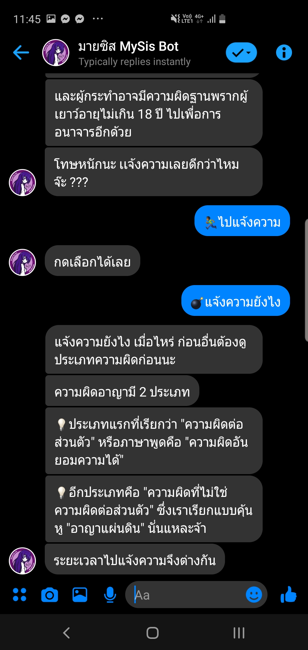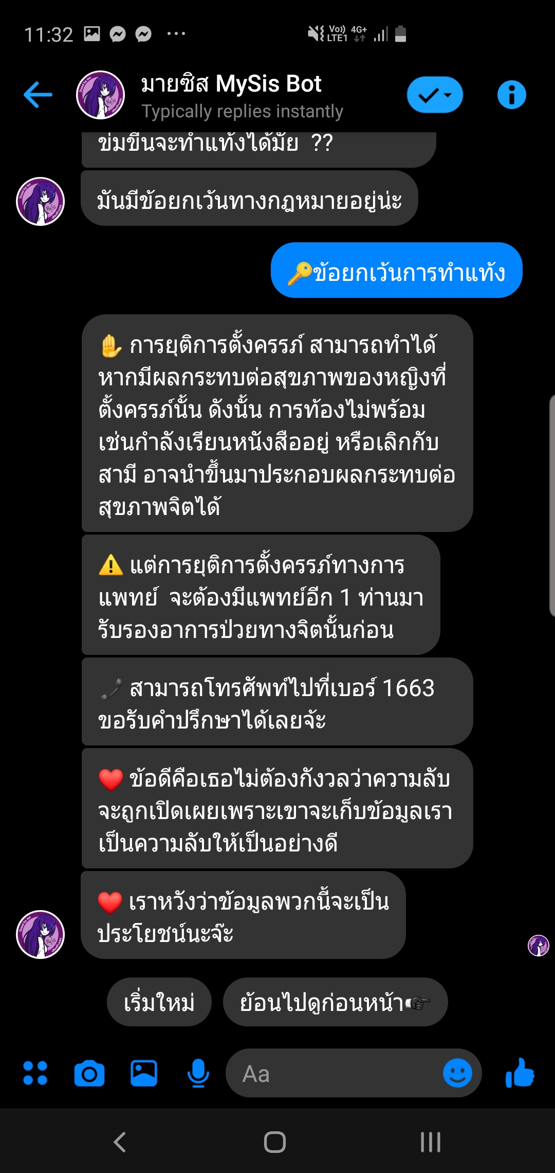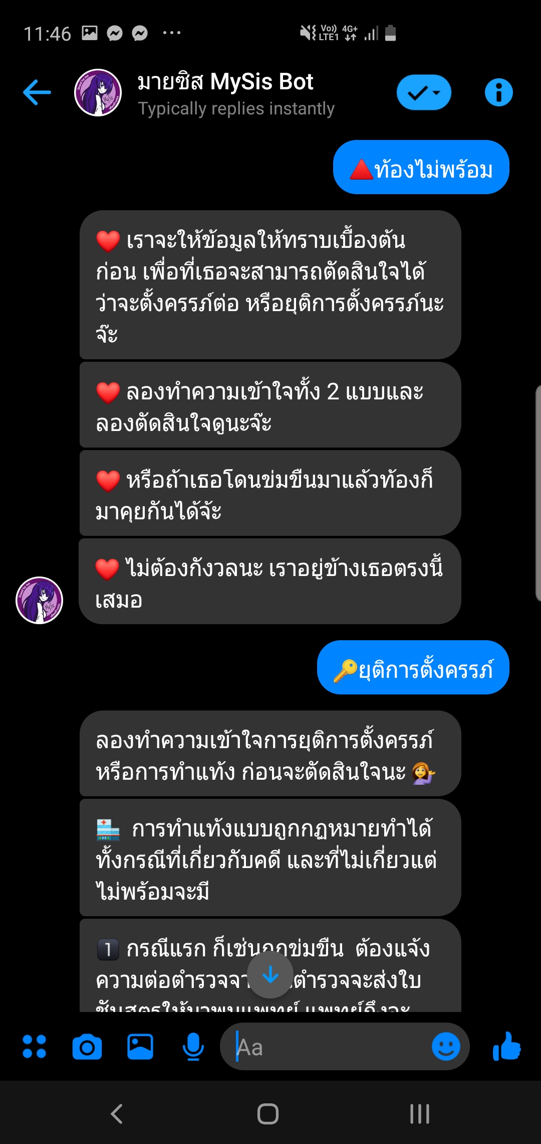 ถ้าใครมีคนใกล้ตัวที่ประสบปัญหาดังที่กล่าวมาอยู่ยังไงลองไปสะกิดบอกได้ หรือจะเซฟเก็บเอาไว้ก่อนก็ดี เผื่อวันหน้าถ้าเจอใครจะได้ไม่ลืมแนะนำให้พวกเค้าได้เจอทางออกกัน โดยสามารถเข้ามาใช้งาน My Sis โดยปรึกษาผ่าน Facebook Messenger “มายซิส My Sis bot” ที่ http://m.me/mysisbot ปัจจุบันตัวแชทบอทนี้จะยังอยู่ในขั้นการทดลอง (BETA) ซึ่งการพูดคุยจะอยู่ในลักษณะการเลือกคำตอบเป็นช้อยส์อยู่ แต่ต่อไปจะพัฒนาสู่การถามตอบแบบอิสระ (Free Text) ซึ่งจะทำให้พูดคุยเป็นธรรมชาติและตรงประเด็น เหมือนคุยกับคนจริงๆมากกว่าบอทต่อไป