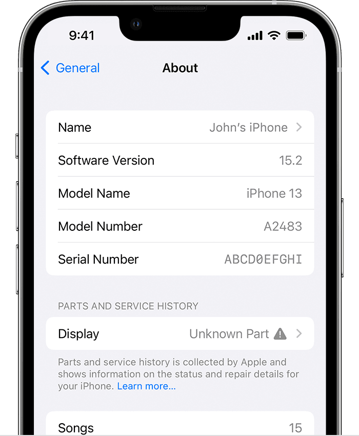 หาก iPhone เครื่องดังกล่าวถูกดำเนินการเปลี่ยนซ่อมอะไหล่โดยใช้ชิ้นส่วนและเครื่องมือของแท้จาก Apple จะมีข้อความ “Genuine Apple Part” หรือ “ชิ้นส่วนแท้ของ Apple” แสดงผลขึ้นมา หรือหากชิ้นส่วนที่เปลี่ยนไม่ใช้ของแท้, ถูกใช้งานหรือติดตั้งใน iPhone เครื่องอื่นมาแล้ว หรือทำงานไม่ตรงตามที่ควรจะเป็น ระบบจะขึ้นว่า “Unknown Part” หรือ “ชิ้นส่วนที่ไม่รู้จัก”