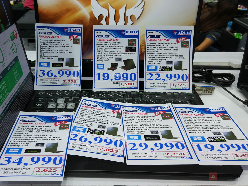 แค่เห็นป้ายราคาก็คงตาลายกันแล้ว สำหรับเกมมิ่งโน้ตบุ๊ครุ่นยอดนิยมที่สุดรุ่นหนึ่งอย่าง ASUS FX505 ที่ภายในงานกันมาทุกรุ่น โดยรุ่นที่น่าสอยเป็นเจ้าของมากที่สุดคือ FX505DY ที่ได้สเปคเป็น Ryzen 5 3550H + RX560x + SSD 512GB + Ram 8 GB พร้อมจอ 120 Hz ในราคาแค่ 19,990 บาท พิเศษภายในงานลดเหลือ 17,990 บาทเท่านั้น (มีจำนวนจำกัด) ส่วนรุ่นอื่นๆ ลดตั้งแต่ 1,000 – 3,000 บาท แล้วแต่รุ่นครับ