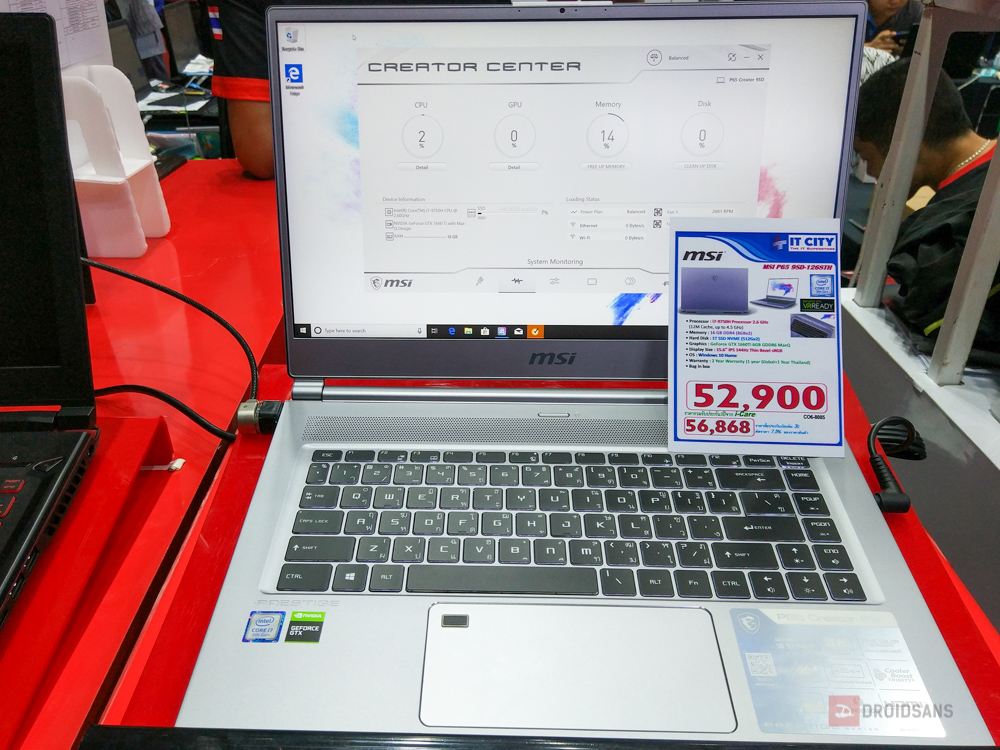 สุดท้ายมาดูที่แบรนด์ MSI กันบ้าง หลายคนอาจจะคุ้นเคยแบรนด์นี้ว่าเป็นโน้ตบุ๊คเล่นเกม เครื่องสีดำๆ แดงๆ แต่ในทุกวันนี้ MSI ก็มีสายโน้ตบุ๊คทำงานเหมือนกันนะ โดยทีเด็ดเลยคือเจ้าตัว P65 9SD ที่ใช้สเปคเป็น i7-9750H + GTX 1660Ti + Ram 8GB +SSD 1TB เรียกว่าสุดจัดปลัดบอก แถมมีน้ำหนักเบาเพียง 1.9 กิโลเ เล่นเกมลื่นๆ พกพาสะดวก ทำงานตัดต่อสบาย ในงานลดเหลือ 50,900 บาทเท่านั้น