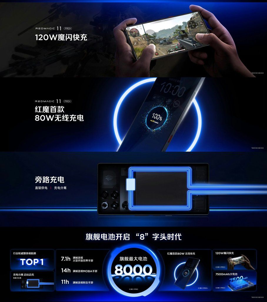 จุดแตกต่างของ RedMagic 11 Pro และ RedMagic 11 Pro+ ก็คือความจุแบตเตอรี่ของรุ่นมาตรฐานที่จะเยอะถึง 8,000mAh รองรับการชาร์เร็ว 80W และการชาร์จแบบ Bypass Charging ส่วนรุ่น 11 Pro+ มีแบตเตอรี่ที่ความุน้อยกว่าที่ 7,500mAh แต่ได้ชาร์จเร็วผ่านสายถึง 120W การชาร์จไร้สาย 80W และการชาร์จแบบ Bypass Charging