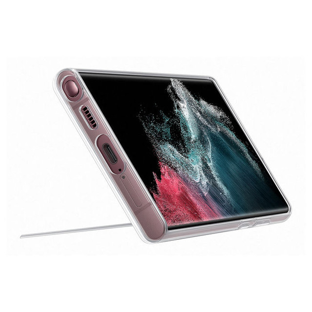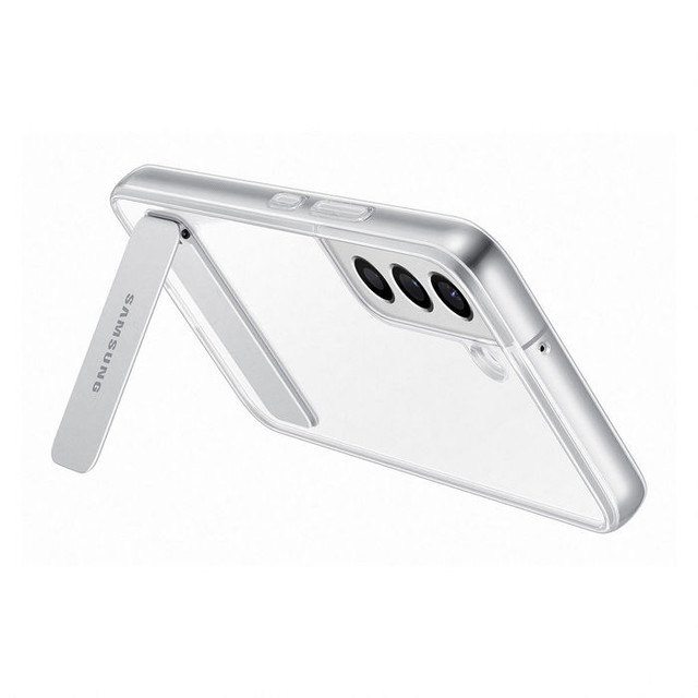 อันนี้เป็นเคสแบบซิลิโคนใสที่มากับขาตั้งแม่เหล็ก โดยมาครบทั้ง Galaxy S22, S22+ และ Galaxy S22 Ultra เลย นอกจากนี้ ในภาพยังโชว์ให้เห็นว่าเคสนี้สามารถตั้งได้ทั้ง 3 ทาง ทั้งแนวตั้งแนวนอนอีกด้วยนะ