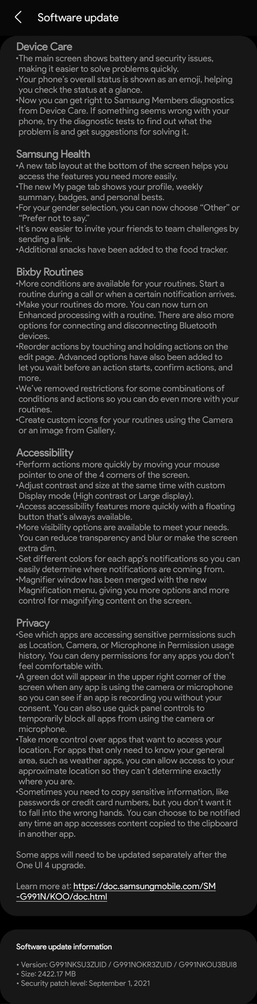 และยังมีการปรับปรุงอื่น ๆ ของแอป Samsung health, Bixby, Accessibility และ Privacy อีกเพียบเลยล่ะ โดยตัวอัปเดต One UI 4 Beta นี้ มีขนาดอยู่ที่ราว ๆ 2.4GB ซึ่งได้รวม Security Patch ของเดือนกันยายนเอาไว้ด้วย สำหรับใครที่ใช้ Galaxy S21 Series อยู่ ก็ต้องมารอลุ้นกันครับว่าประเทศไทยจะได้กับเค้าเมื่อไหร่