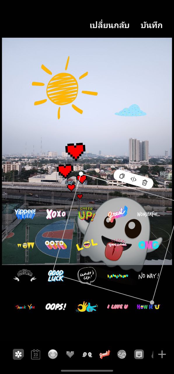 หากเลื่อนมาหน้าสติ๊กเกอร์ จะได้พบตัวเลือกอิโมจิ ตัวอักษรและกราฟิกสุดน่ารักต่าง ๆ เพิ่มขึ้นมา และเรายังสามารถกดเพิ่มสติ๊กเกอร์ของตัวเองได้ โดยการกดลากเส้น เลือกวัตถุออกมา ก็จะได้สติ๊กเกอร์เอาไว้ใช้กับภาพอื่น ๆ แล้ว