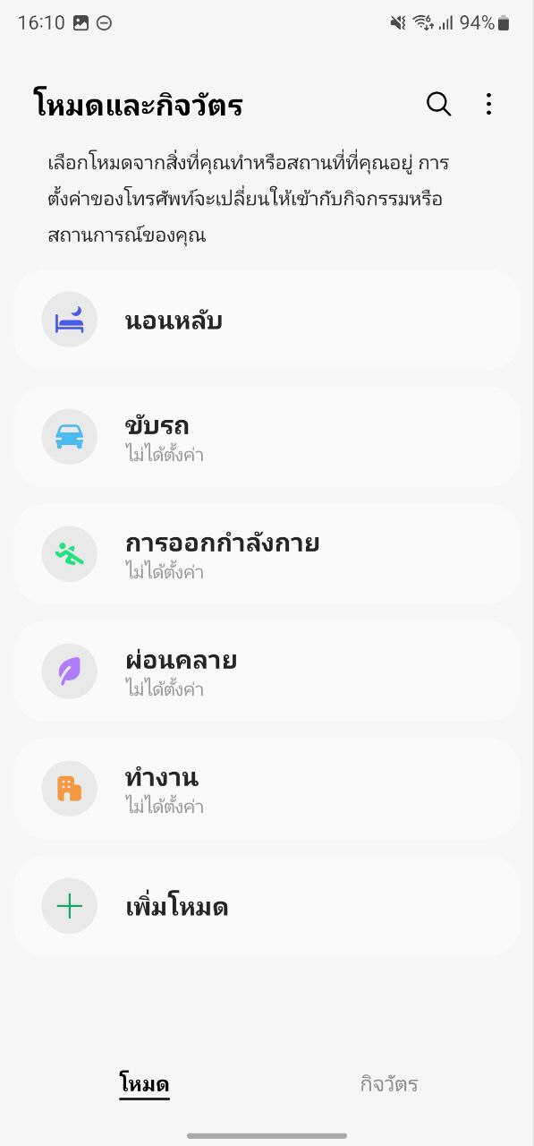 ฟีเจอร์เด็ดอีกอย่าง ที่อาจเปลี่ยนวิธีใช้มือถือของทุกคนไปเลย คือระบบตั้งโหมดและกิจวัตร (Modes and Routines) ที่ทำให้เราเลือกได้ว่า จะให้มือถือทำงานอะไรอย่างอัตโนมัติได้บ้าง ส่วนหน้าโหมดก็จะเป็นการตั้งค่าตามคำแนะนำของ Samsung แบ่งเป็นโหมดแยกย่อยอย่าง การนอน การขับรถ การออกกำลังกาย ฯลฯ โดยเค้าจะมีตัวเลือกปรับแต่งที่เหมาะสมกับกิจกรรมนั้น ๆ มาให้เลย