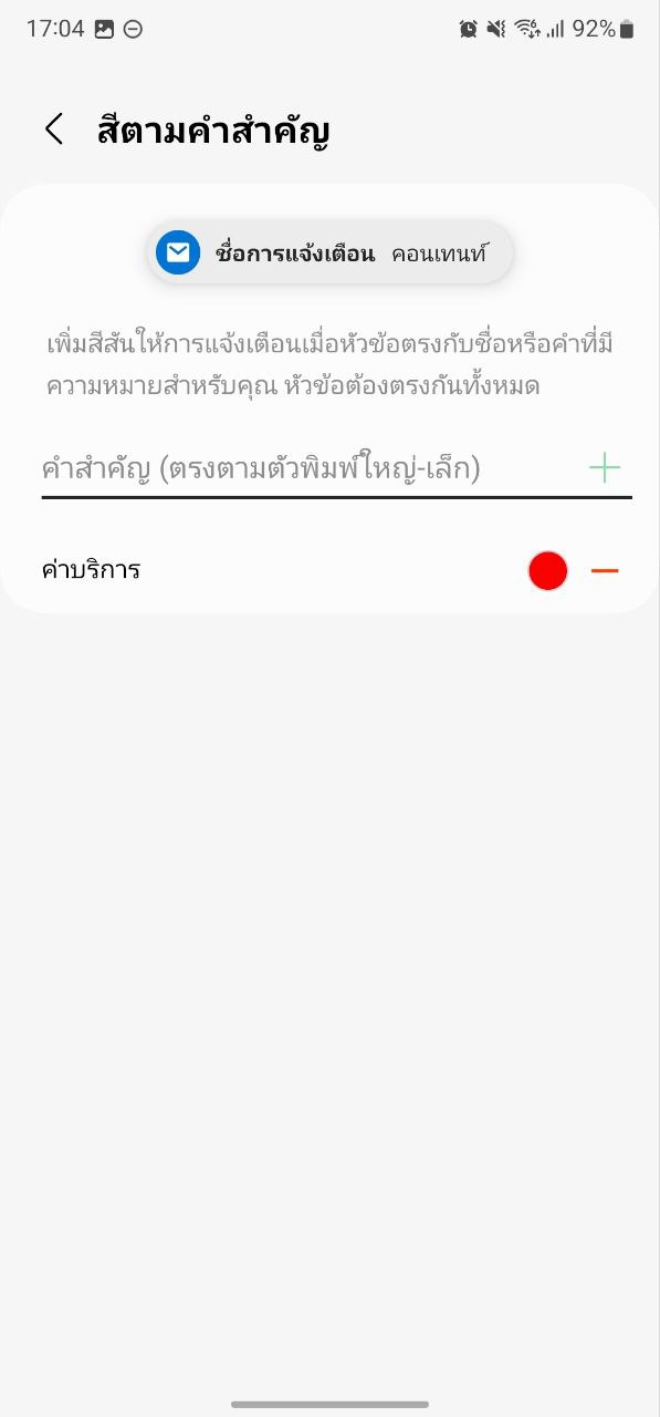 อีกระบบดี ๆ สำหรับการแจ้งเตือน คือสามารถตั้งสีที่แสดงหน้าต่างแจ้งเตือนได้ ตามคีย์เวิร์ดหรือคำสำคัญ ยกตัวอย่างหากเราจะเน้นสังเกตเรื่องการจ่ายบิลต่าง ๆ อาจใส่คำว่า ‘ค่าบริการ’ แล้วก็ตั้งสีแดงให้เห็นชัด ๆ ได้แบบนี้