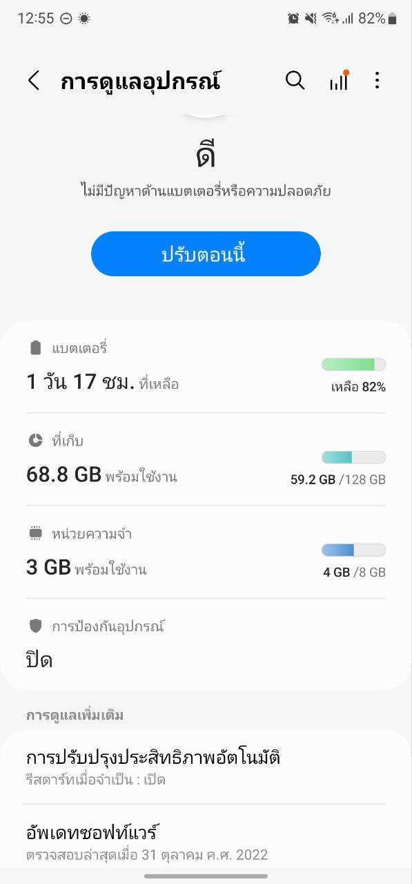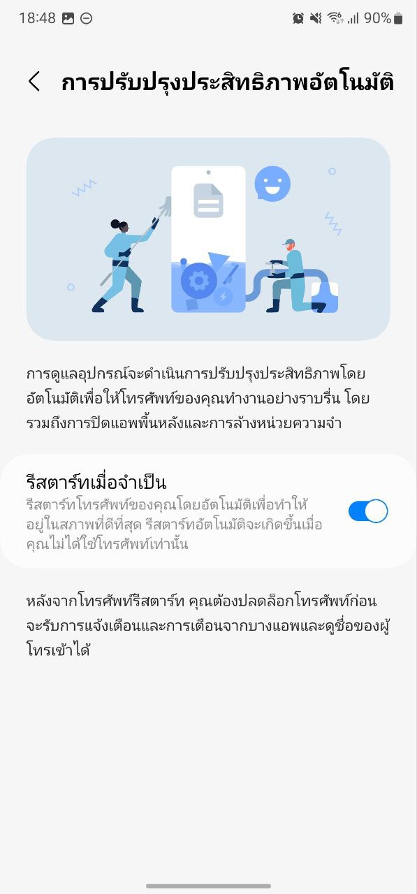 ในเมนูการดูแลแบตเตอรี่และอุปกรณ์ (Device Care) จะมีตัวเลือกให้เปิดได้ว่า จะให้มือถือคอยรีสตาร์ทเครื่องด้วยตัวเองมั้ย ซึ่งตรงนี้จะช่วยทำให้มือถือของเราทำงานได้อย่างมีประสิทธิภาพมากยิ่งขึ้น เพราะจะเป็นการเคลียร์แอปและระบบต่าง ๆ ในมือถือของเรา