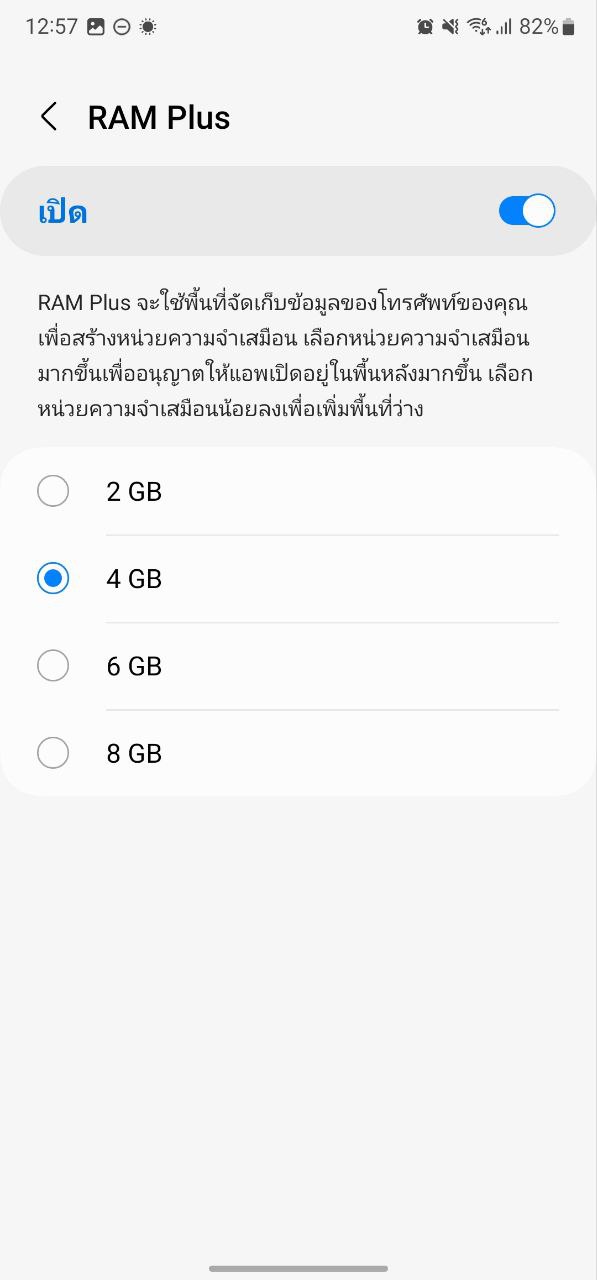 นอกจากนี้หากกดเมนูหน่วยความจำ จะได้เข้ามาเลือกตั้งค่าฟีเจอร์ Ram Plus หรือการเพิ่มแรมแบบเสมือนได้ จะมีให้เลือกว่าจะเปิดเอาแรมเพิ่มเท่าไร หรือจะปิดไปไม่ใช้งานเลยก็ได้ อันนี้จากในกลุ่มคนยังเถียงกันอยู่ว่าเปิดหรือปิดดีกว่ากัน ดังนั้นลองด้วยตัวเองก่อนจะได้รู้ว่าใช้งานเครื่องแล้วต่างกันแค่ไหนครับ