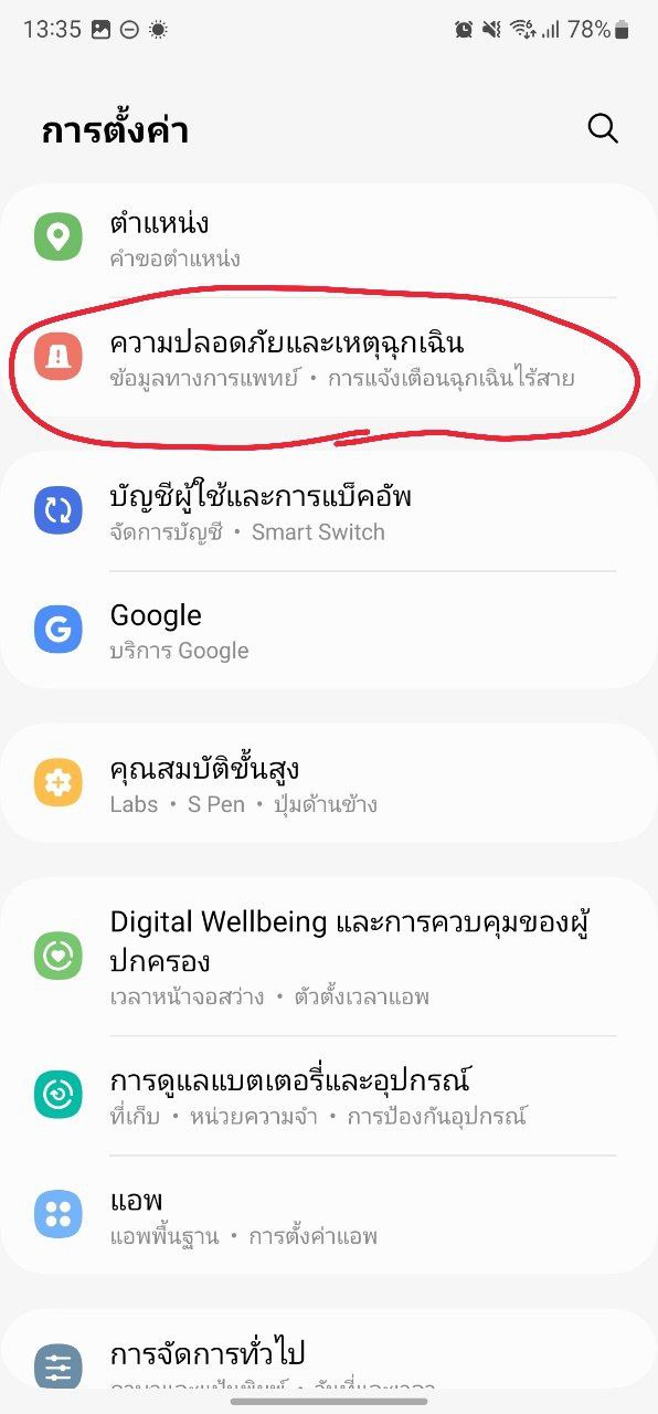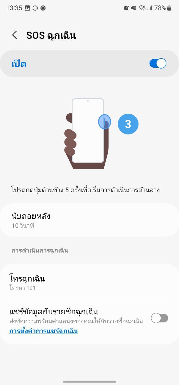 หากเราเกิดอุบัติเหตุ หรือสถานการณ์ฉุกเฉินใด ๆ ที่ต้องการเรียกความช่วยเหลือ ให้กดปุ่ม Power หรือปุ่มเปิดปิดเครื่อง 5 ครั้งเร็ว ๆ แล้วไม่ว่าเครื่องจะปิดหรือเปิดอยู่ มันก็จะส่งเสียงแจ้งเตือน นับถอยหลัง 10 วินาทีก่อนโทรเรียกเบอร์ฉุกเฉิน ซึ่งเราสามารถไปตั้งค่าการนับถอยหลัง และเบอร์ฉุกเฉินได้ ที่หน้า “ความปลอดภัยและเหตุฉุกเฉิน” แล้วเลือกเมนู “SOS ฉุกเฉิน”