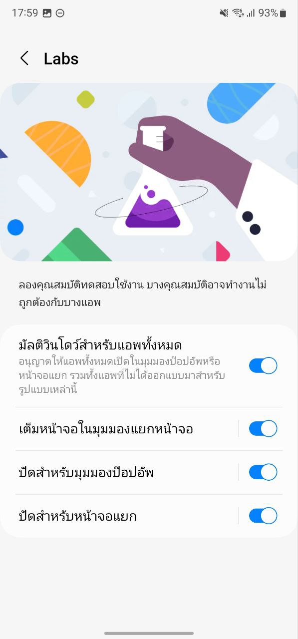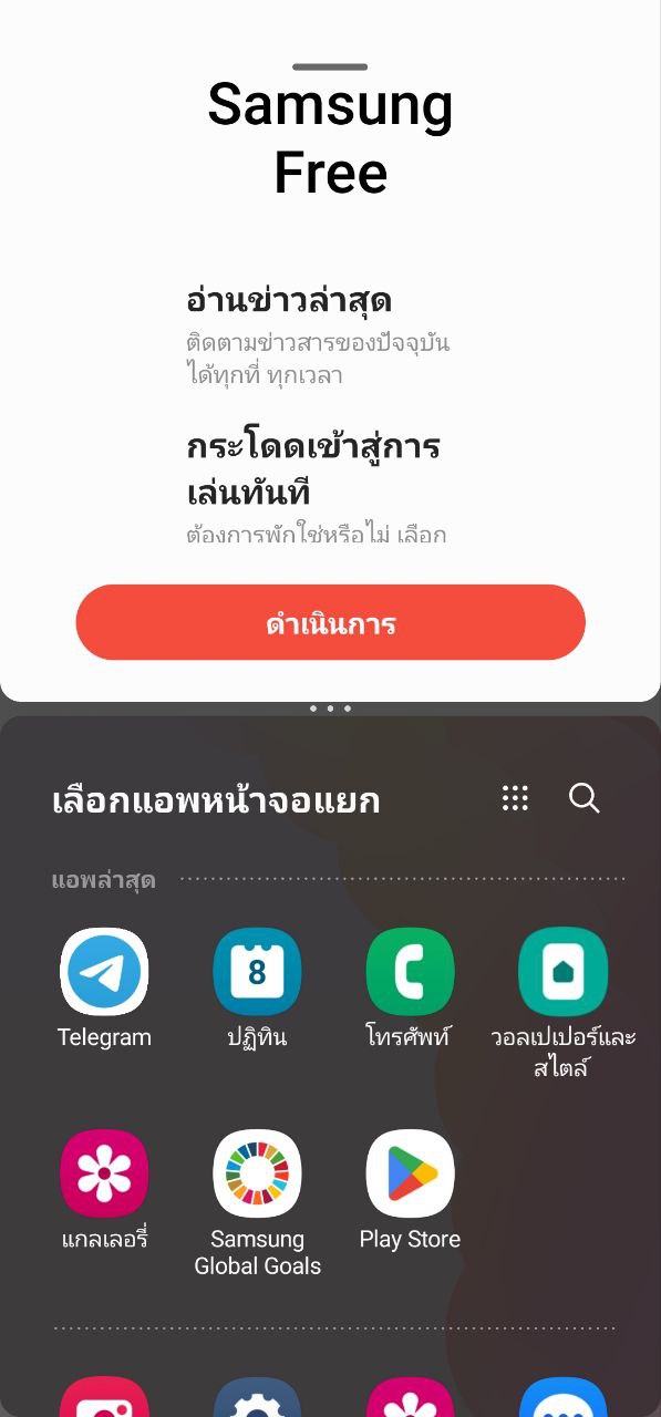 ปกติเวลาจะแบ่งจอก็ต้องกดหลายขึ้นตอน แต่หลังอัปเดตใหม่ ไปตั้งค่าที่หน้า Samsung Lab ก็จะเปิดให้ใช้สองนิ้วลากขึ้นจากด้านล่างจอ ก็จะขึ้นแบ่งหน้าจอให้เลยทันที หรือมีอีกวิธีคือลากแอปมาจาก Quick Panel แล้วลากมาด้านบนหรือล่างของจอ ก็จะได้แบ่งหน้าสองจอเหมือนกัน