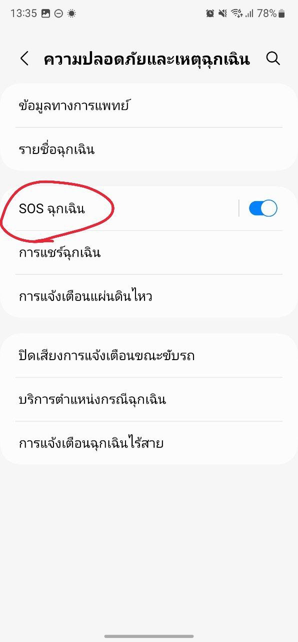 หากเราเกิดอุบัติเหตุ หรือสถานการณ์ฉุกเฉินใด ๆ ที่ต้องการเรียกความช่วยเหลือ ให้กดปุ่ม Power หรือปุ่มเปิดปิดเครื่อง 5 ครั้งเร็ว ๆ แล้วไม่ว่าเครื่องจะปิดหรือเปิดอยู่ มันก็จะส่งเสียงแจ้งเตือน นับถอยหลัง 10 วินาทีก่อนโทรเรียกเบอร์ฉุกเฉิน ซึ่งเราสามารถไปตั้งค่าการนับถอยหลัง และเบอร์ฉุกเฉินได้ ที่หน้า “ความปลอดภัยและเหตุฉุกเฉิน” แล้วเลือกเมนู “SOS ฉุกเฉิน”