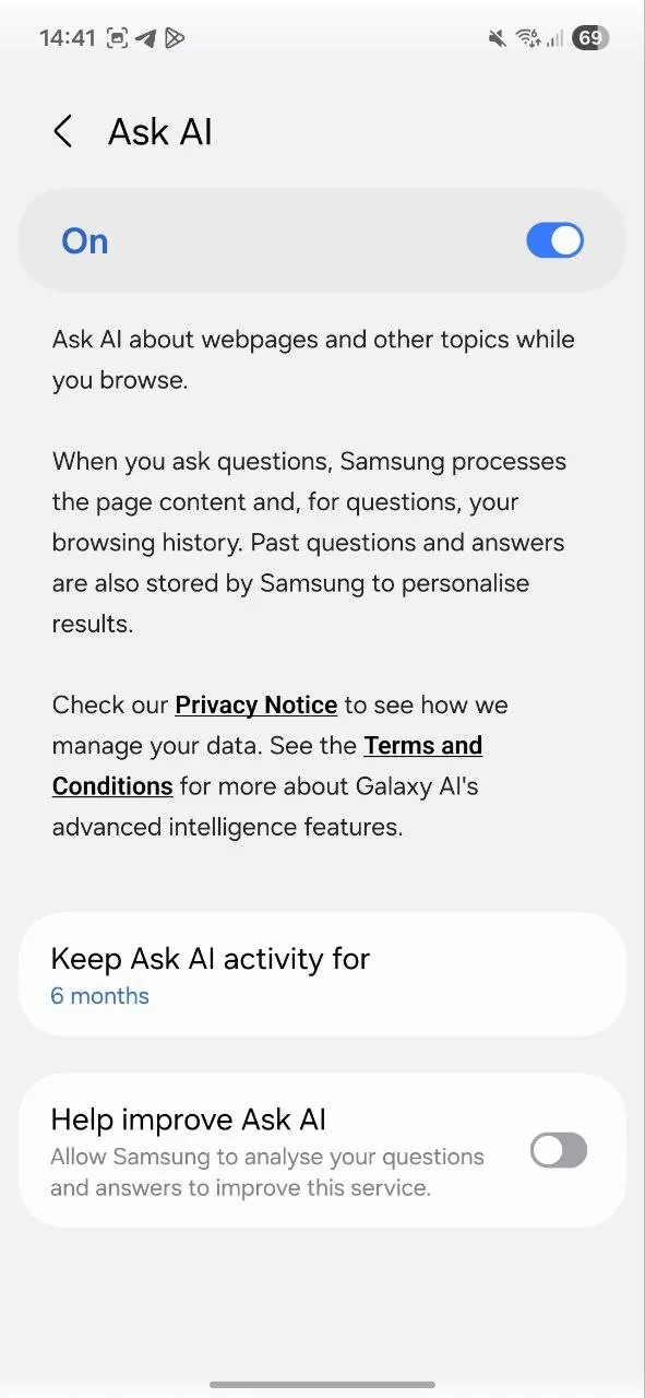 ในหน้ารายละเอียดของฟีเจอร์ Ask AI ระบุว่า “AI จะทำการประมวลผลจากเนื้อหาบนหน้าเว็บ คำถามที่เราต้องการรู้ และประวัติการเข้าชมเว็บ” โดยจะมีการบันทึกประวัติคำตอบและคำถามที่เราคุยกับ AI ในการเรียนรู้พฤติกรรมของผู้ใช้สำหรับการประมวลผลครั้งต่อ ๆ ไปด้วย